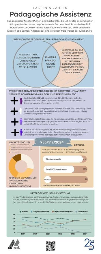 Dabei verbinden wir den theoretischen Unterricht mit praktischer Übung. Einmal wöchentlich führen die Teilnehmenden praxisausgelagerten Unterricht in einer Schule oder einer Flüchtlingseinrichtung durch. Hier soll theoretisches Wissen mit praktischen Erfahrungen verbunden werden. Dabei werden sie durch Hospitationen und fachliche Beratung unterstützt. Die Weiterbildung inkludiert die Ausbildung zur schulischen Inklusionsassistenz.https://giz.berlin/courses/schulische-inkluisionsassistenz.htm