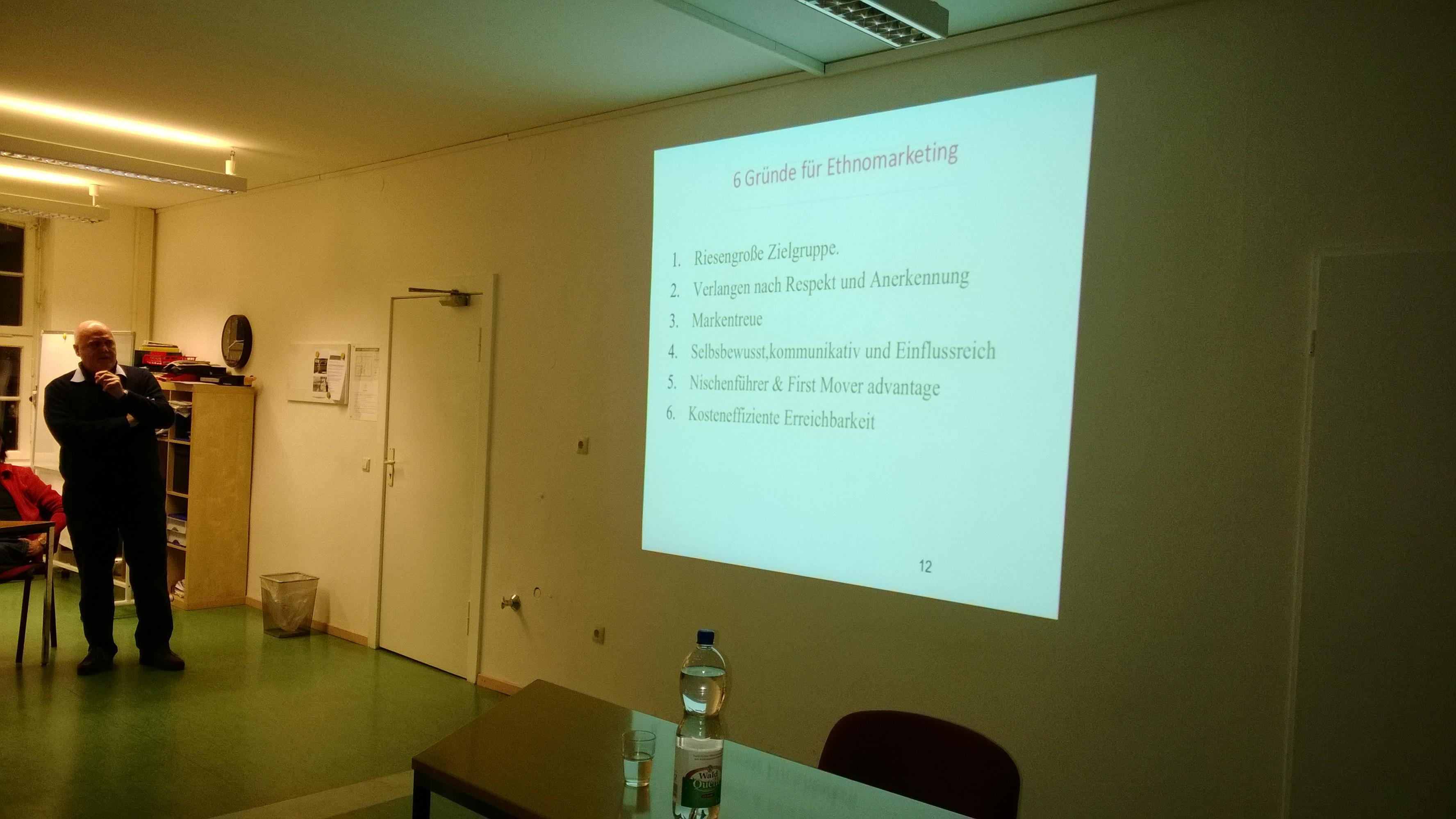 Herr Royer stellte einführend die steigende Relevanz von Ethnomarketing für Unternehmerinnen und Unternehmer dar. Anschließend zeigt er auf, worauf Unternehmerinnen und Unternehmer achten müssen, wenn sie Ethnomarketing einsetzen. Sehr interessant war auch die Vorstellung von erfolgreichen Ethnomarketing-Kampagnen von großen und kleinen Unternehmen.