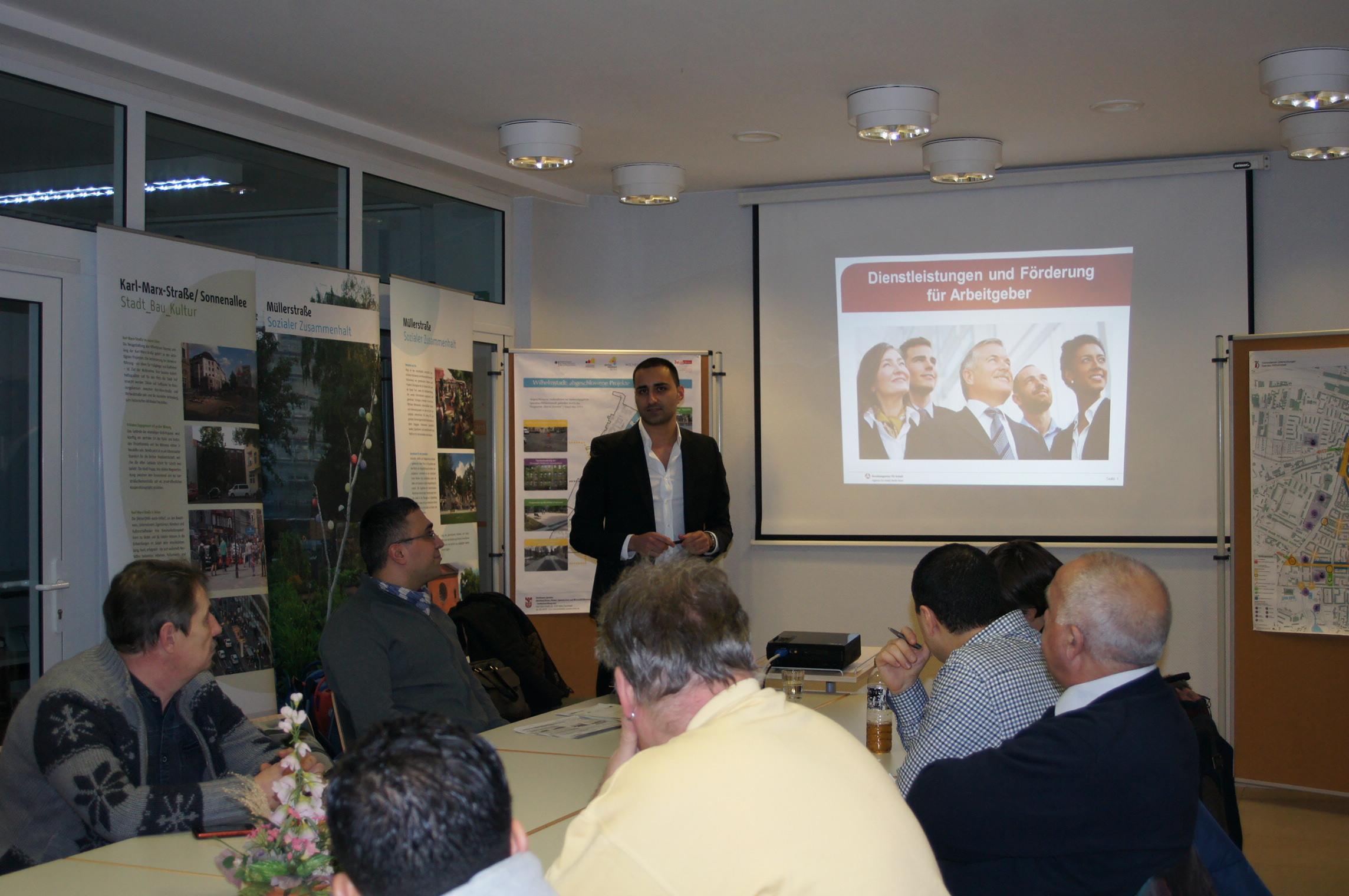 Mit Herrn Akdemir und Herrn Tanrıverdi konnten zwei Experten von der Agentur für Arbeit Spandau für den Abend gewonnen werden. Beide Experten stellten Fördermöglichkeiten für Unternehmen vor. Anschaulich und detailliert wurde über die verschiedenen Fördermöglichkeiten wie Eingliederungszuschuss oder WeGebAU informiert.