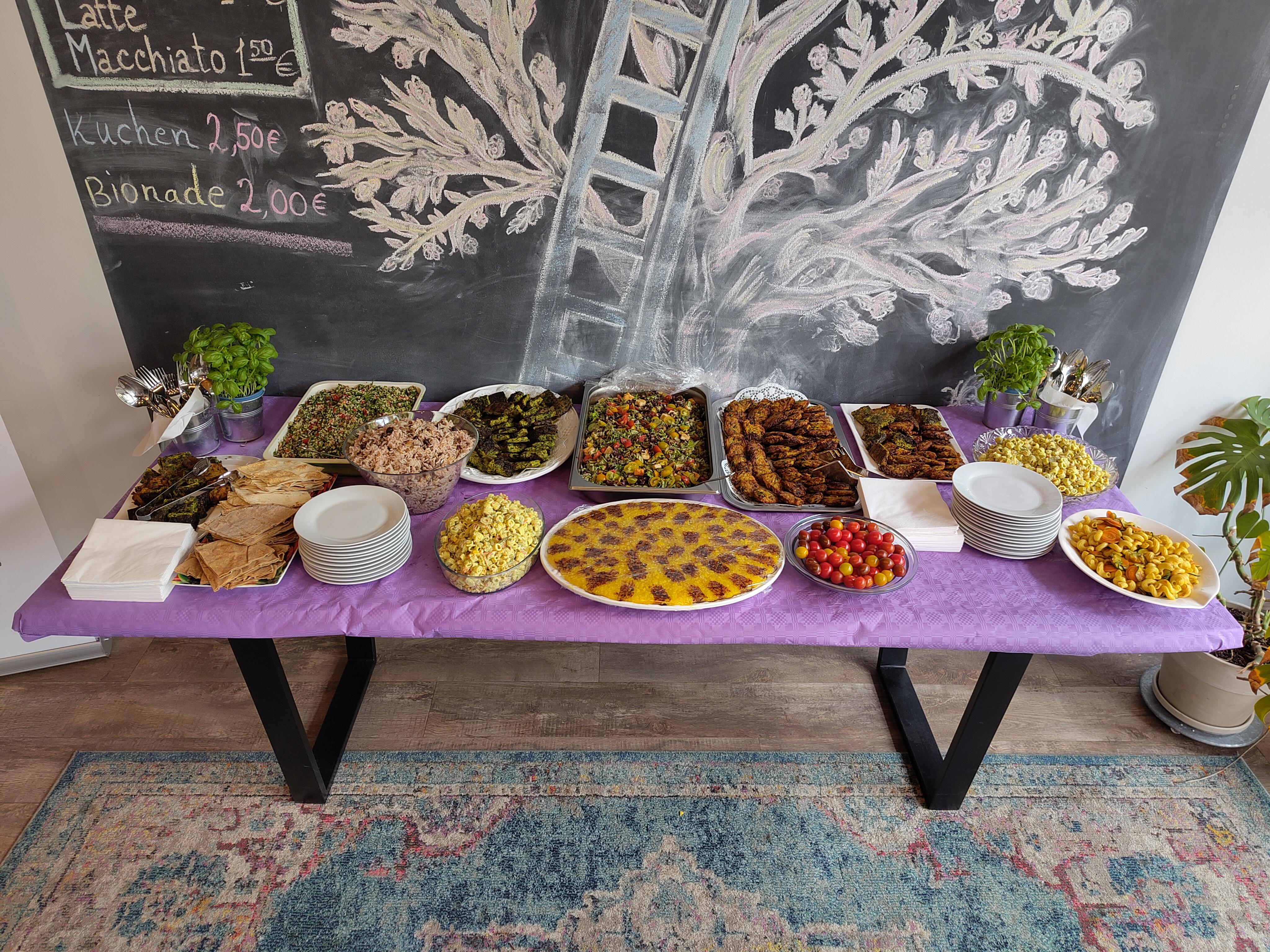 Ein buntes Rahmenprogramm mit zahlreichen kostenfreien Aktivitäten für Kinder im Innenhof wurde von den in Weiterbildung befindlichen Pädagogischen Assistent*innen des Trägers mit viel Engagement, Freude und Geduld angeboten. Auch der Mieterbeirat war aktiv beteiligt und betreute einen Stand für Kinderaktivitäten. Persische Livemusik bereicherte den Nachmittag und trug zu einer fröhlichen Stimmung bei. Für alle Besucher*innen gab es ein köstliches Buffet vom Restaurant heimaten. Die Nachbarschaft konnte sich in einer Zukunftswerkstatt zu Zielen austauschen zum Thema "Wie soll unser Kiez sein?". Zum Abschluss fand eine Lesung aus einem Buch "Kennen wir uns?" des GIZ-Kollegen und Autors Yahya Alaous statt.
