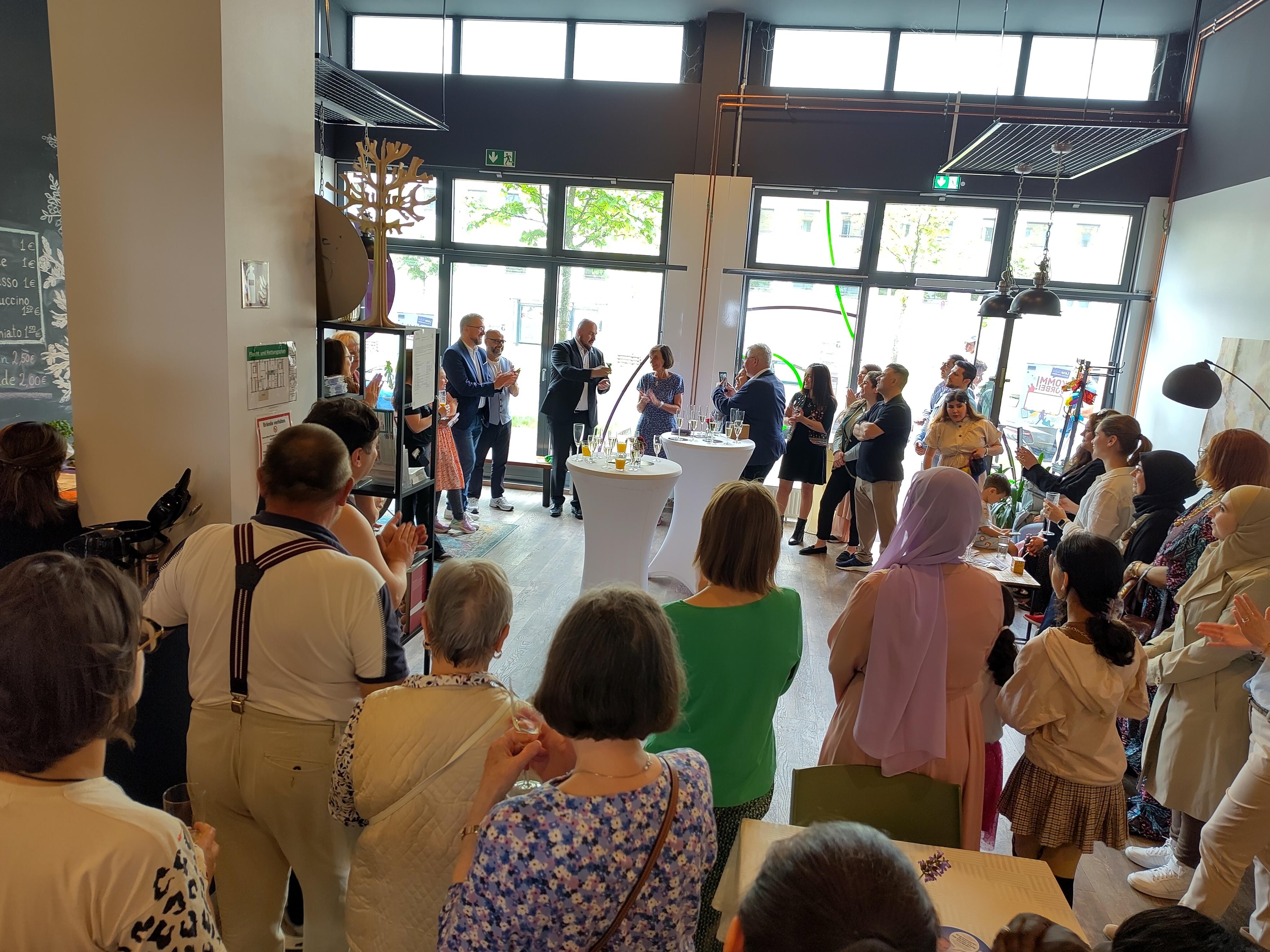 Bezirksbürgermeister Bewig begrüßte die Gäste zum 5-jährigen Jubiläum. Die Berlinovo engagiert sich seit Beginn mit einer Raumspende für heimaten. Der Geschäftsführer Herr Aleithe, die Bereichsleitung Frau Düring und die Teamleitung Quartiersmanagement Frau Klima dankten der GIZ für die täglichen Aktivitäte. Frau Fliegel (Vereinigung Wirtschaftshof Spandau e.V.) gratulierte ebenfalls und wünschte der Begegnungsstätte heimaten weitere Jahre des erfolgreichen Betriebs.