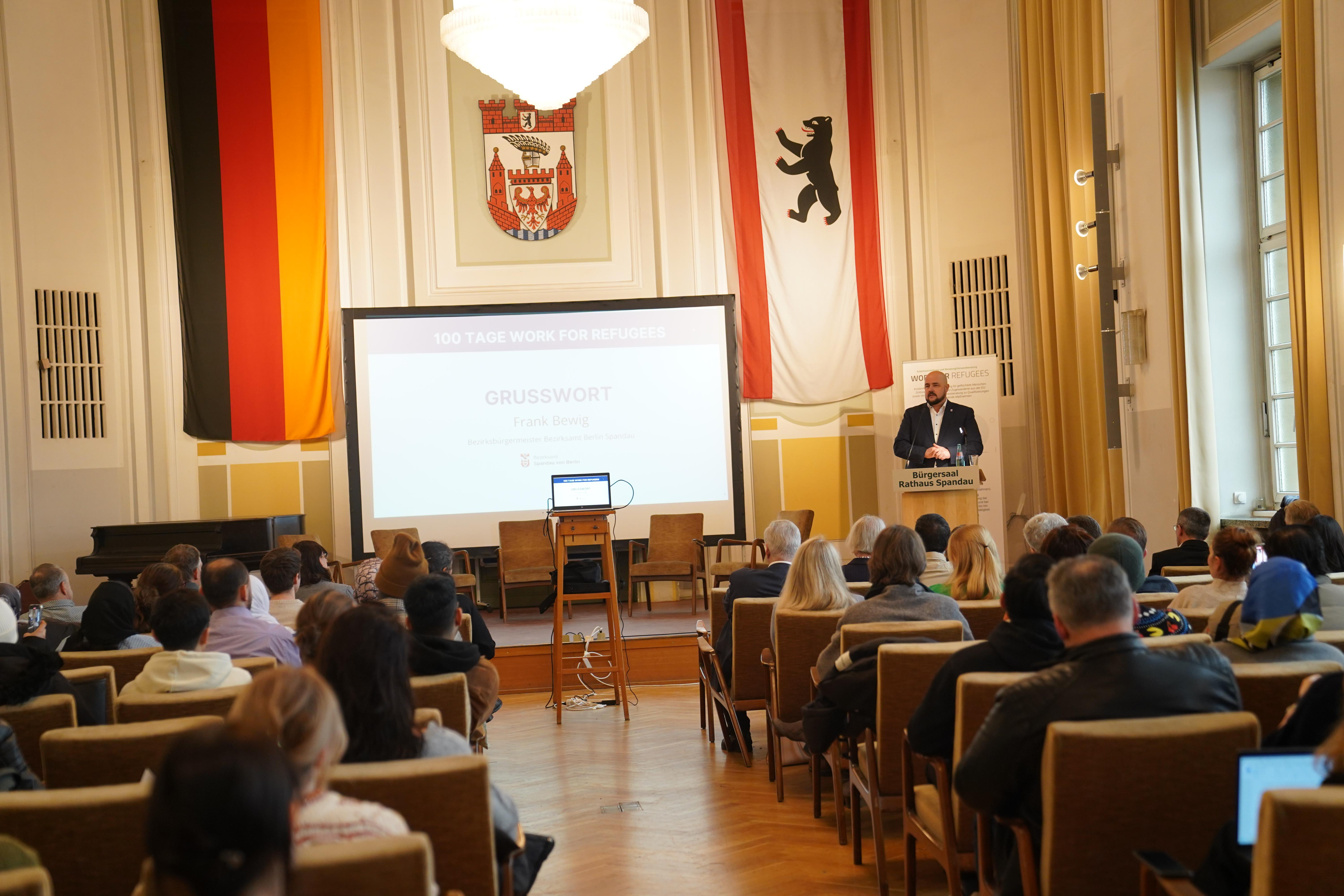 Am 17. Januar 2025 fand im Bürgersaal des Rathauses Spandau die Veranstaltung "100 Tage Work for Refugees" statt. Die Vorstellung der Ergebnisse markierte einen wichtigen Schritt in der Entwicklung des Projekts, das im September 2024 ins Leben gerufen wurde, um Geflüchtete, Drittstaatsangehörige und Zugewanderte aus der EU auf ihrem Weg in Arbeit und Qualifizierung zu unterstützen.