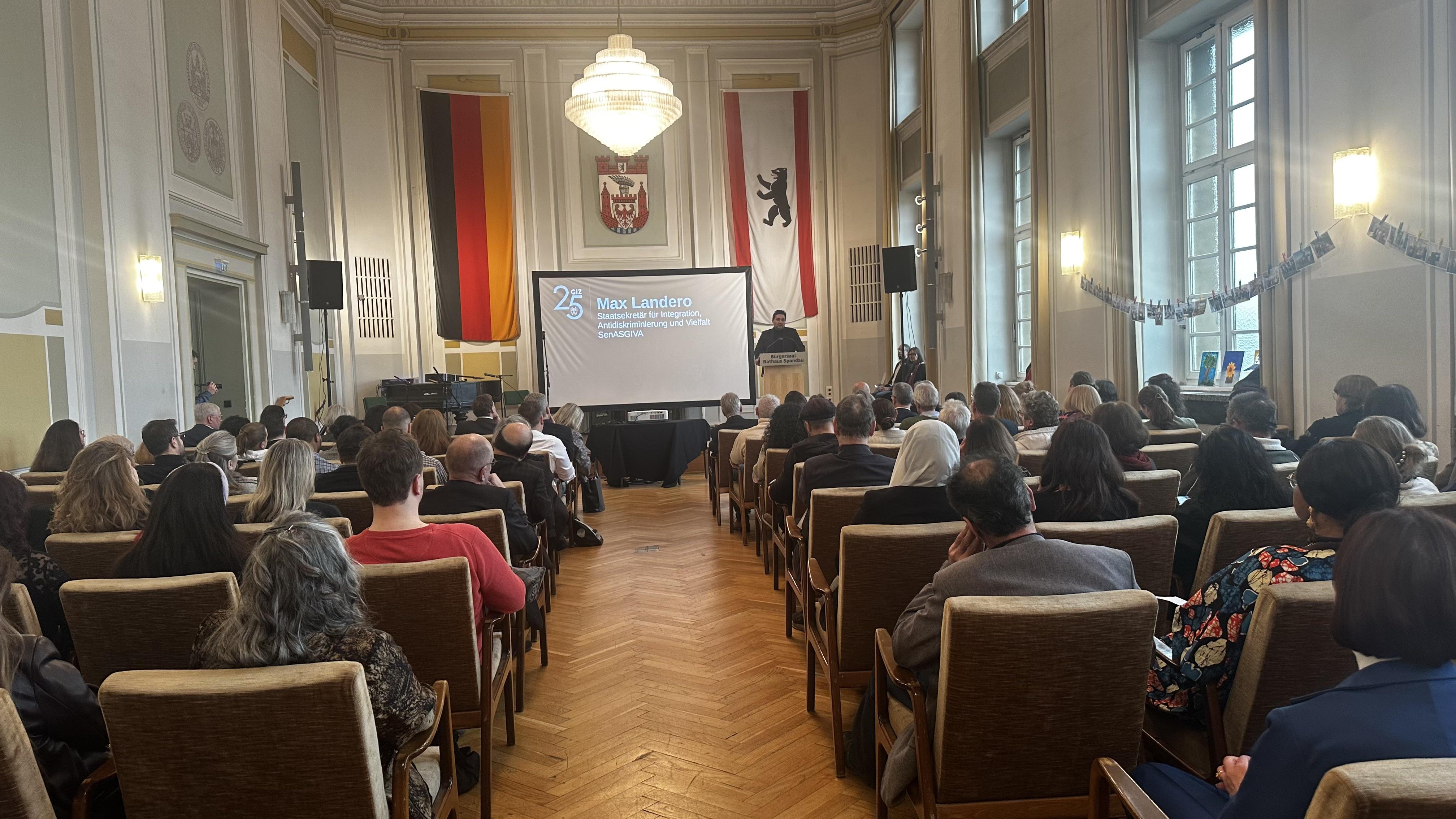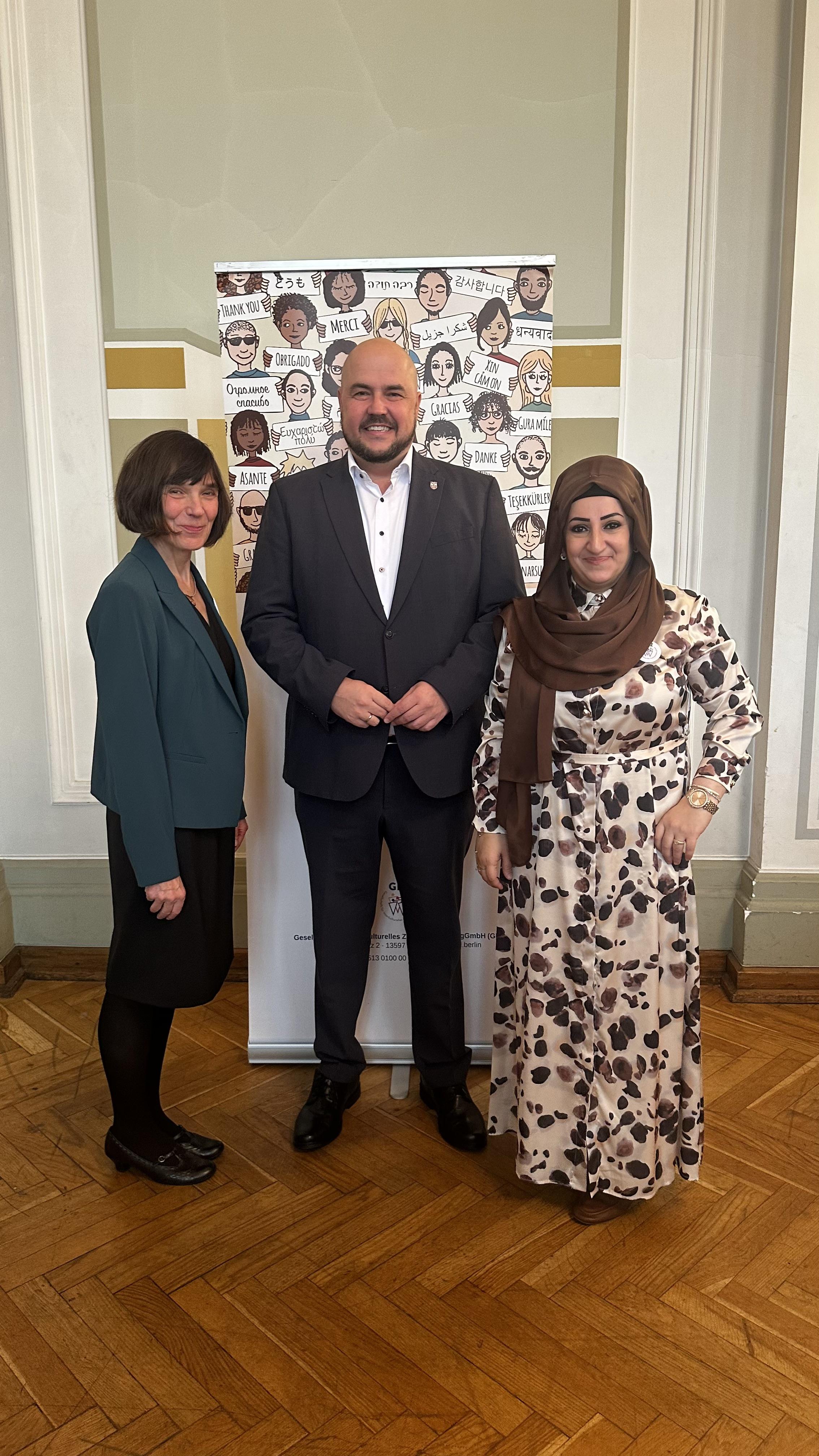 Danach folgten die Grußworte von Max Landero, Staatssekretär für Integration, Antidiskriminierung und Vielfalt (SenASGIVA), Frank Bewig, Bezirksbürgermeister von Spandau, sowie Dr. Carola Brückner, stellvertretende Bezirksbürgermeisterin und Bezirksstadträtin für Bildung in Spandau. In ihren Beiträgen würdigten sie die kontinuierliche und fachlich fundierte Arbeit der GIZ sowie deren Bedeutung für die Integrationsarbeit auf Bezirks- und Landesebene.
