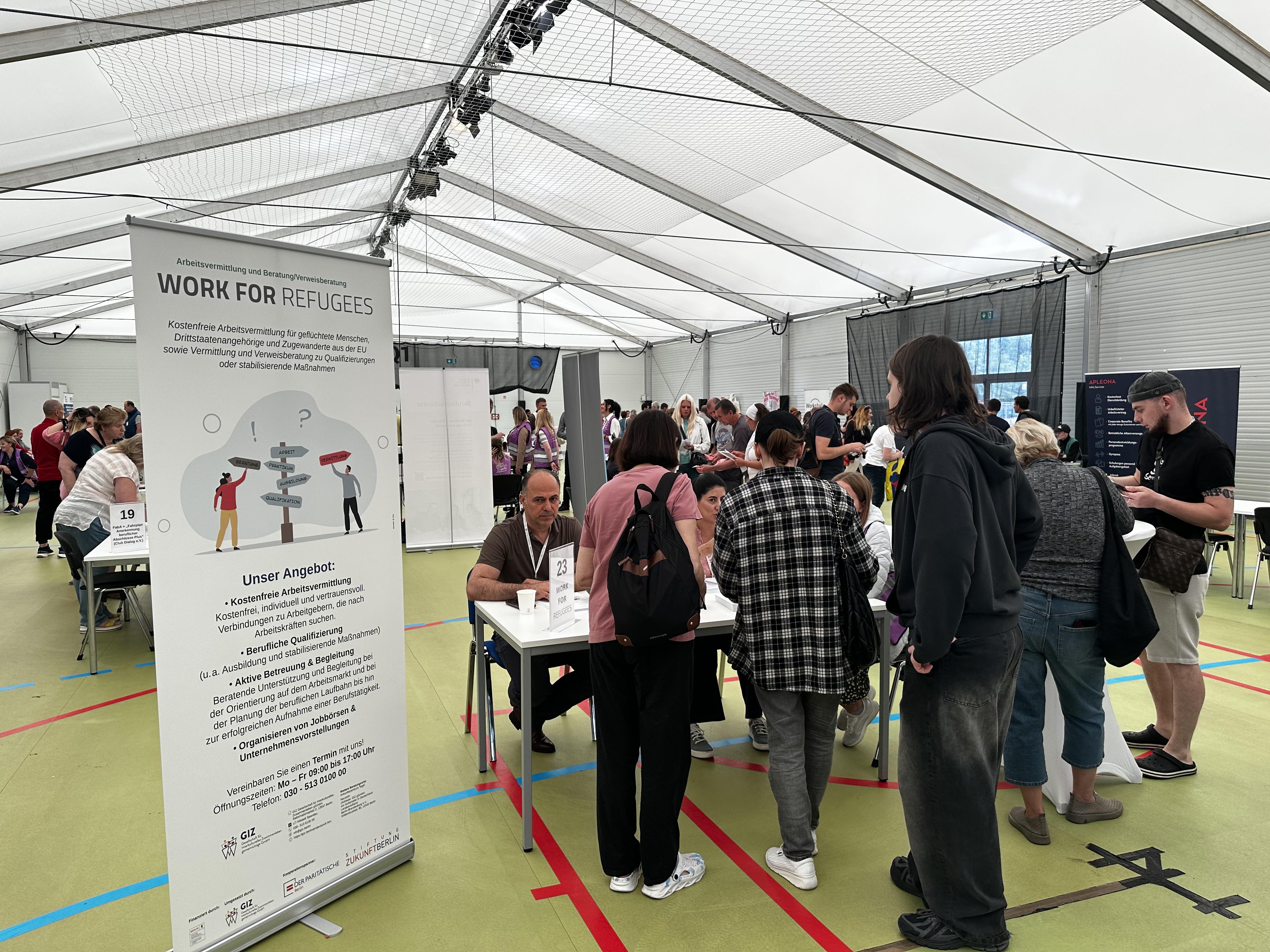 Die Jobbörse wurde vom Projekt „Work for Refugees" in Kooperation mit dem Landesamt für Flüchtlingsangelegenheiten (LAF) und der DRK Sozialwerk Berlin gGmbH (DRK-SWB) organisiert. Das Projekt „Work for Refugees“ wird von der Senatsverwaltung für Arbeit, Soziales, Gleichstellung, Integration, Vielfalt und Antidiskriminierung gefördert und umgesetzt durch die Gesellschaft für interkulturelles Zusammenleben gGmbH sowie die Kooperationspartner Paritätischer Wohlfahrtsverband LV Berlin e. V. und Stiftung Zukunft Berlin.
