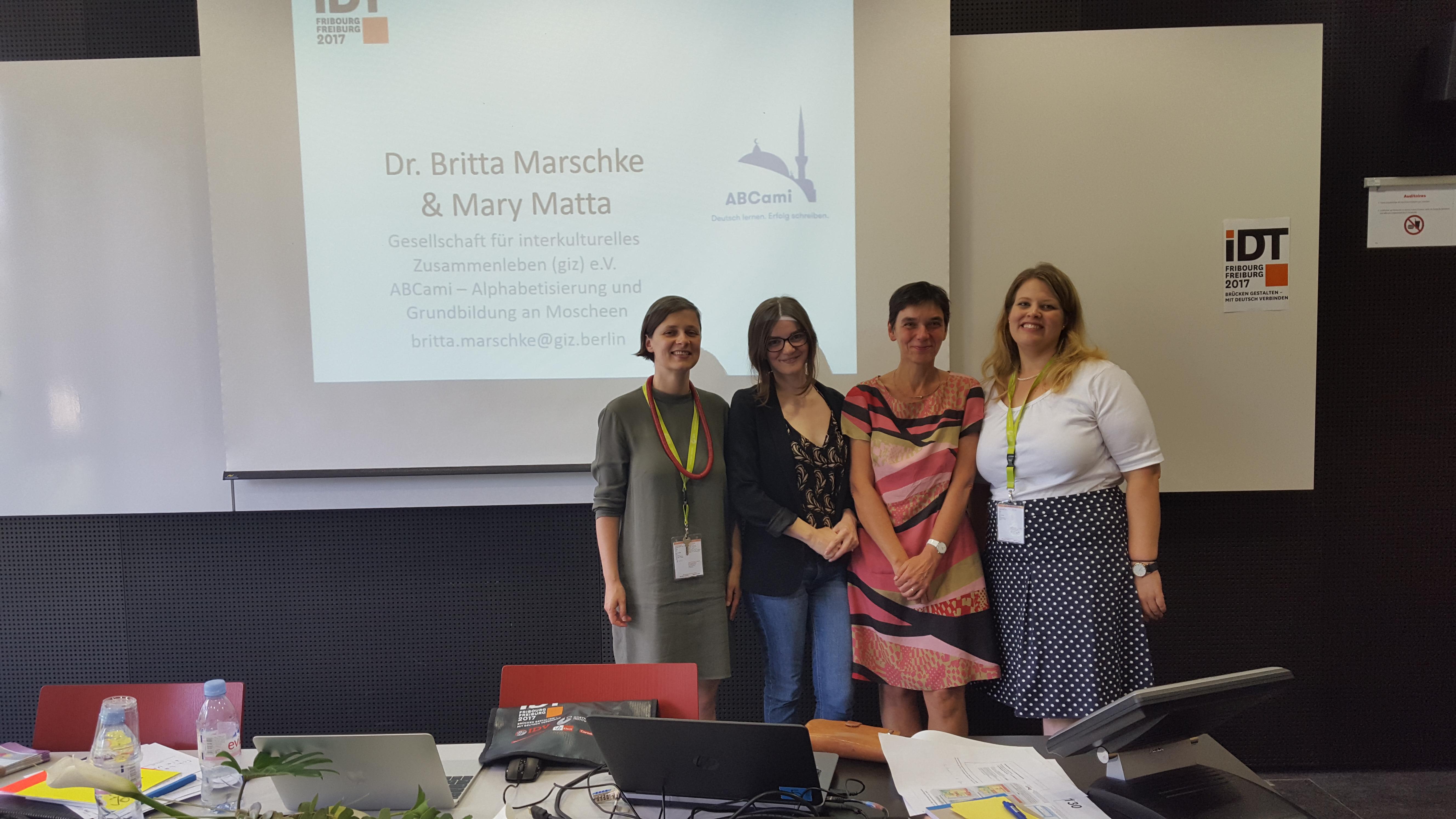 Vom 31.07. bis zum 04.08.17 fand in Fribourg in der Schweiz die Internationale Deutschlehrertagung statt. Unter dem Motto "Brücken gestalten - mit Deutsch verbinden" wurde im Rahmen der Sektion "Deutsch für Schul - und/oder Schriftungewohnte auch das Projekt ABCami vorgestellt. Der Vortrag von Mary Matta und Britta Marschke über unseren kontrastiven Ansatz der Alphabetisierung stieß auf reges Interesse beim Fachpublikum. Vernetzungsgespräche wurden geführt und Kooperationspartner von der DW, dem Hueber-Verlag bis zum DVV wurden an den Messeständen besucht. Der Beitrag von ABCami ist für den Tagungsband der IDT ausgewählt und erscheint 2018.