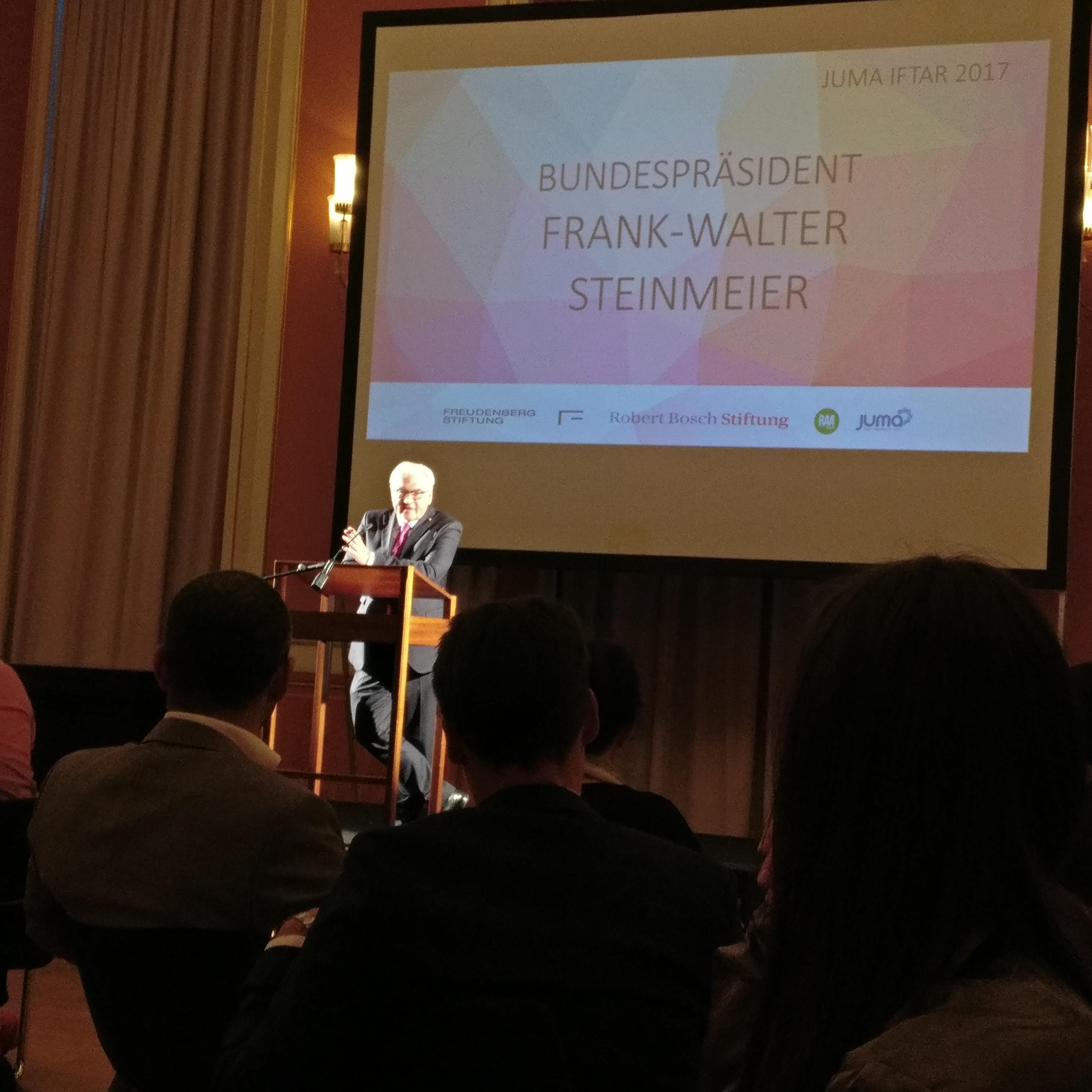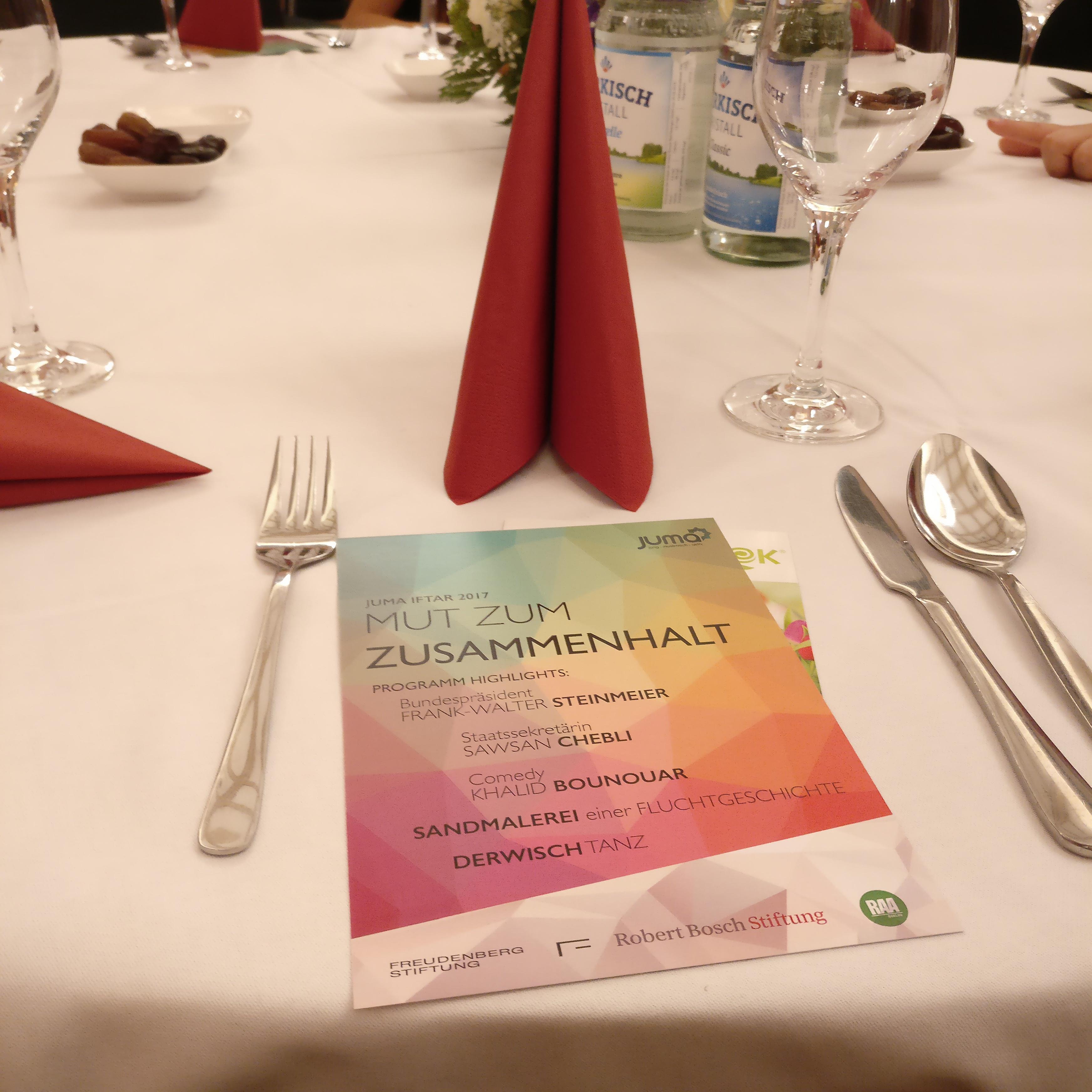 Der Abend stand unter dem Motto „Mut zum Zusammenhalt“ und bot ein vielfältig-buntes Programm an, u.a. mit dem Comedian Khalid Bounouar von Rebell Comedy und einer russischen Künstlerin, die durch die Kunst der Sandmalerei die Fluchtgeschichte von zwei geflüchteten Mädchen aus dem Irak erzählte. Ehrengast des Abends waren Bundespräsident Frank-Walter Steinmeier und Staatsekräterin Sawsan Chebli. In seiner Rede betonte der Bundespräsident den Stellenwert einer vielfältigen Gesellschaft und die Notwendigkeit einer gemeinsamen Gestaltung ebendieser. Nach einer Rezitation aus dem Koran, wurde durch den Gebetsruf das gemeinsame Fastenbrechen angegangen.