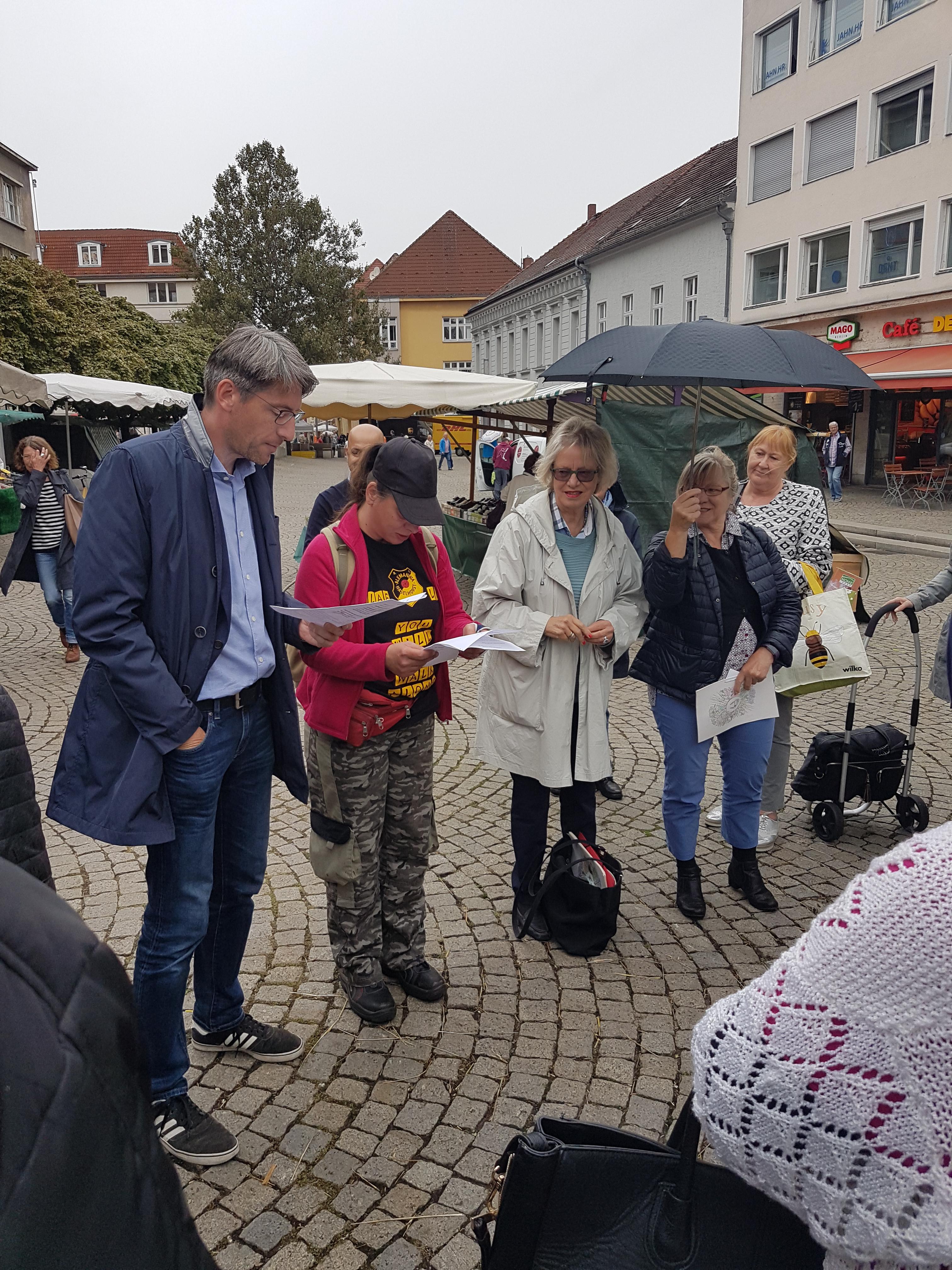 Eine Aktion der etwas anderen Art spielte sich indes in Berlin-Spandau in Kooperation mit dem Alphabündnis Spandau ab: Um auf die Lage von Betroffenen aufmerksam zu machen, lasen Bundestagsabgeordneter Swen Schulz (SPD) und Gabriele Fliegel vom Wirtschaftshof-Spandau gemeinsam mit Lernenden aus dem Lerncafé Passant*innen in der Spandauer Altstadt Gedichte und Kochrezepte vor.