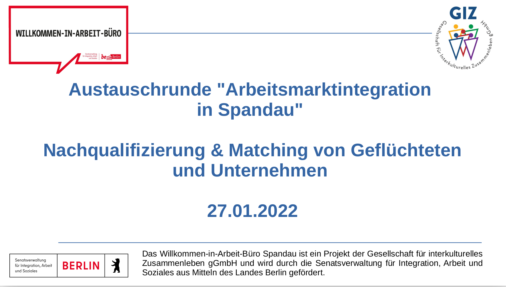 Die erste Austauschrunde „Arbeitsmarktintegration in Spandau“ mit dem Thema "Nachqualifizierung & Matching von Geflüchteten und Unternehmen" organisiert und durchgeführt durch das Willkommen-in-Arbeit-Büro (WiA-Büro) Spandau fand am 27.01.2022 online statt.