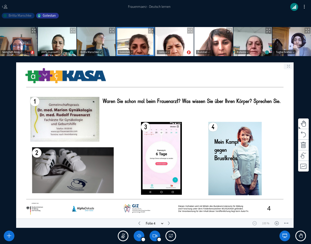 Im Rahmen des Frauenmärz fand am 9. März eine Unterrichtsstunde "Deutsch lernen zum Thema weiblicher Körper" statt. Die kontrastive Online-Unterrichtsstunde, durchgeführt von Dr. Sedigheh Alizadeh, Tugba Bektas, Laura Diab und Dr. Britta Marschke, vermittelte den 20 Teilnehmer*innen Wissen rund um das Thema Frauengesundheit. Eingebettet in die Themen Verhütung, Schwangerschaft und Frauenarzt wurden kontrastiv Präpositionen eingeführt. Die erfüllten und hochmotivierten Gesichter der Frauen zeigten ein weiteres Mal die Bedeutung der Muttersprache im Unterrichtsgeschehen, insbesondere bei sensiblen Unterrichtsthemen wie diesen.