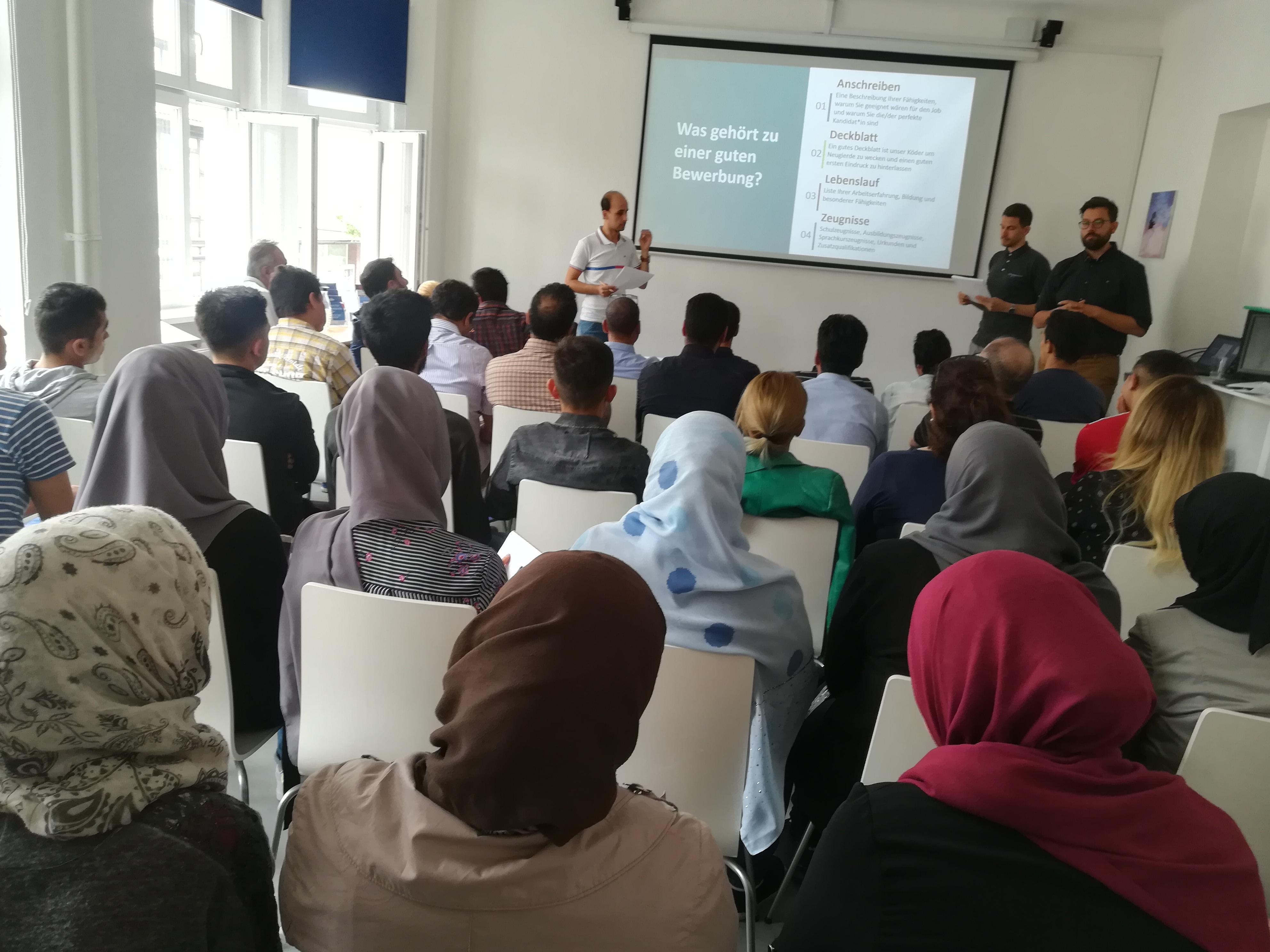 Insgesamt 44 Interessierte lauschten gespannt den Ausführungen des Vortragenden mobilen Bildungsberaters Benedikt Michalsky, der die wichtigsten Informationen rund um Anschreiben, Lebenslauf und Bewerbungsprozess praxisnah und anschaulich vermittelte. Die gesamte Infoveranstaltung wurde von den beiden Dolmetschern für Arabisch (Ibrahim Hassan) und Farsi (Hashmatullah Safi) konsekutiv gedolmetscht, was es allen Beteiligten ermöglicht hat, größtmöglichen Nutzen aus der Veranstaltung zu ziehen.