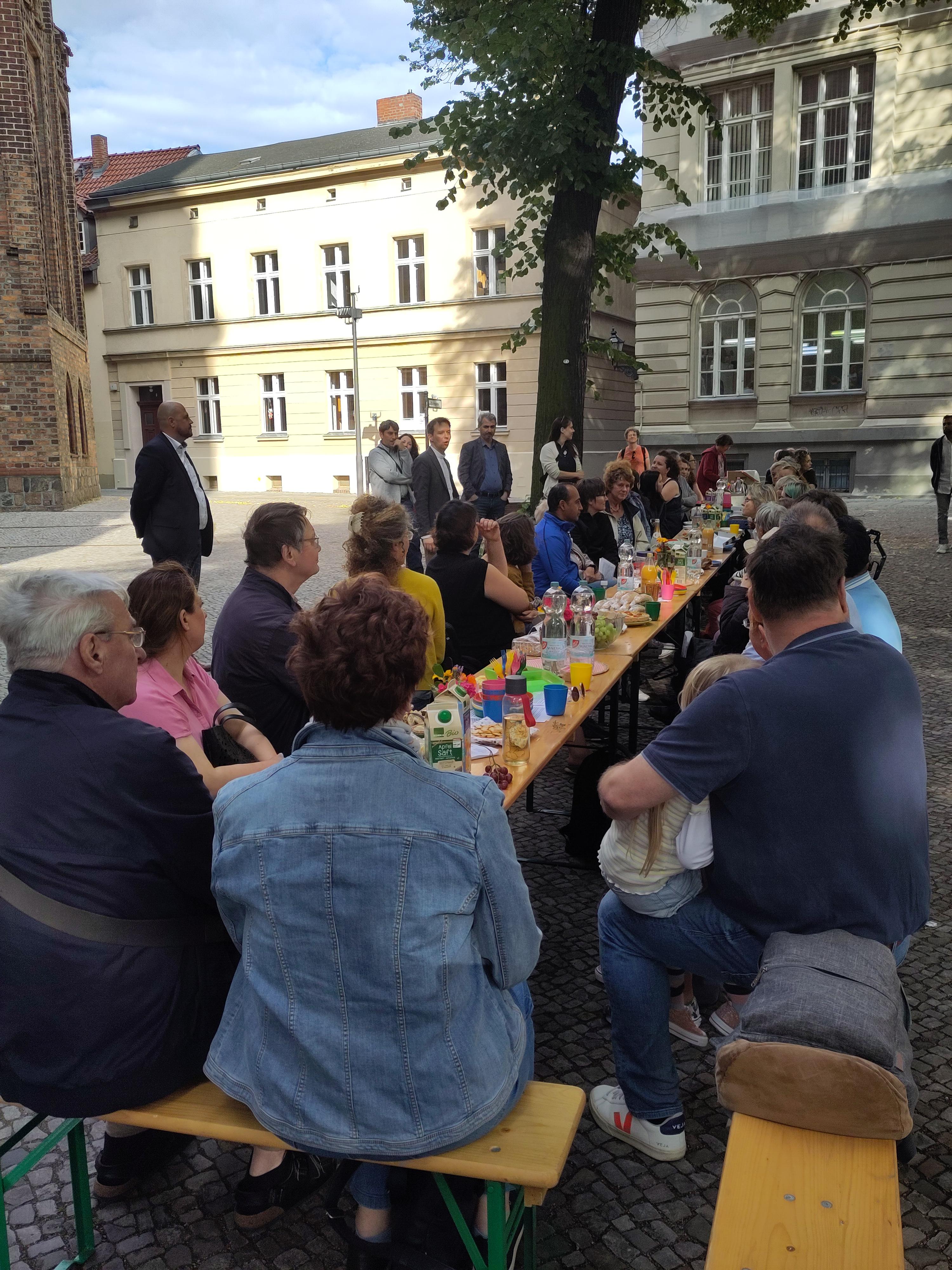 Das Netzwerk für Demokratie, Toleranz, Respekt und Vielfalt Spandau feierte am 03. Juli 2023 sein einjähriges Bestehen mit einem gemeinsamen Abendessen unter freiem Himmel auf dem Reformationsplatz. Dieser Abend wurde durch die aktive und freudige Teilnahme der Netzwerkmitglieder:innen* und die freiwillige Partizipation der Menschen aus der Gesellschaft, die sich mit den Zielen des Bündnisses identifizieren, ein großer Erfolg. Die lange Tafel war mit vielfältigen leckeren Gerichten bunt gedeckt.