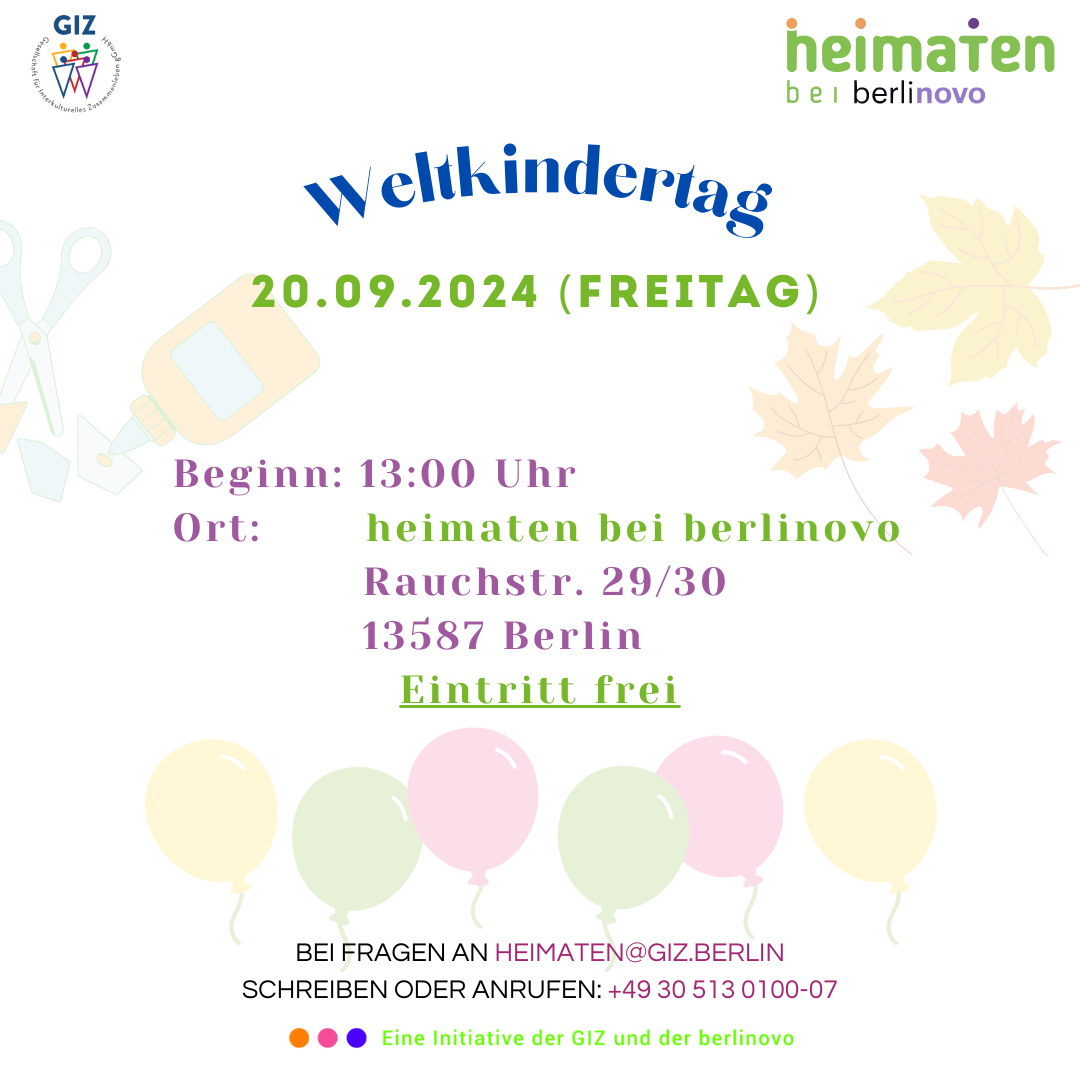 Anlässlich des Weltkindertages laden wir am Freitag, den 20. September 2024, Kinder zum Basteln und Spielen ein! Von 13:00 h bis 16:00 h können sich alle interessierten Kinder und natürlich auch Erwachsene sich unseren Aktionen anschließen. Zum Schluss gibt es auch leckere Kleinigkeiten für alle!