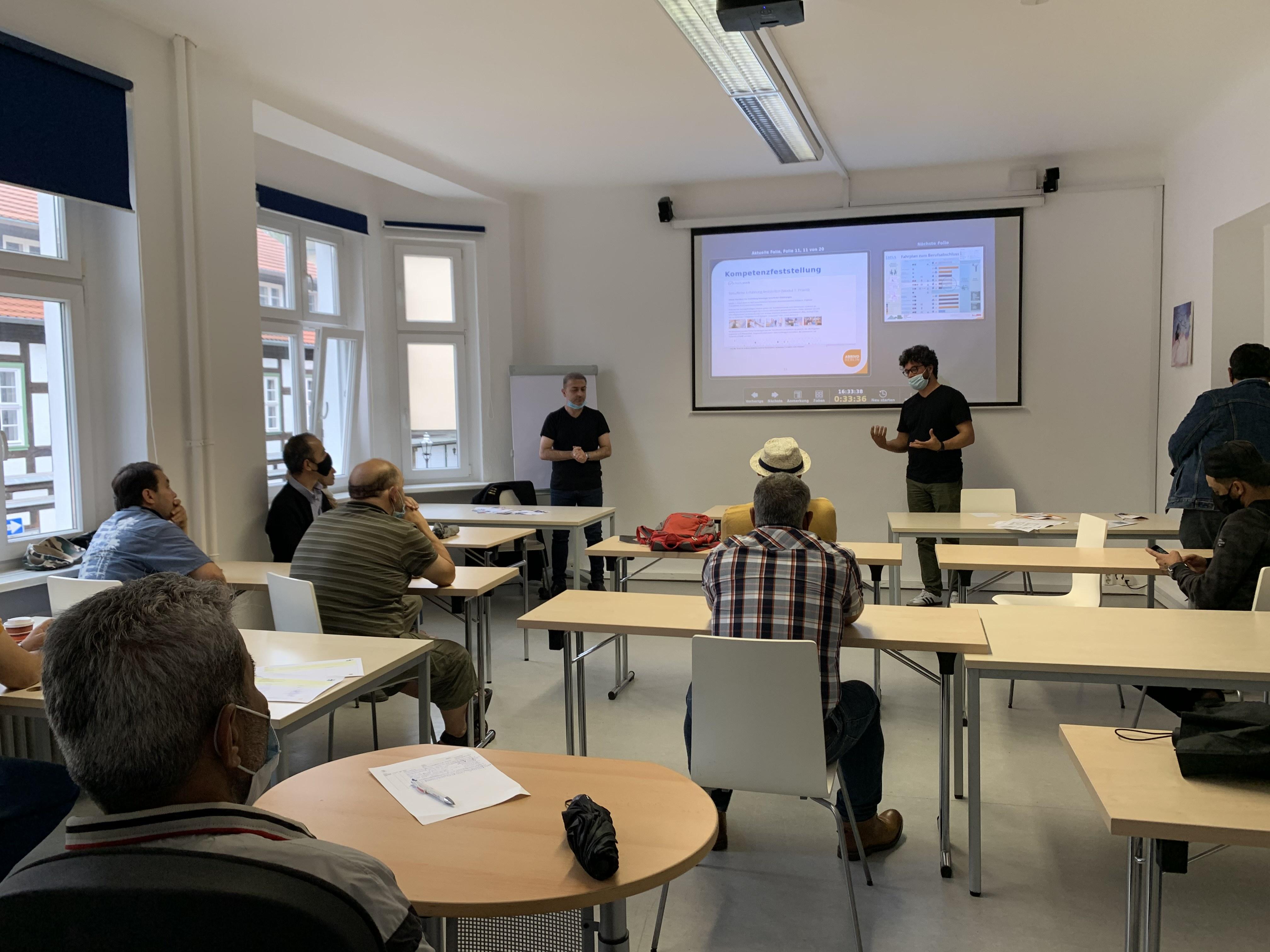 Die Referenten von Arrivo machten deutlich, dass eine Berufsausbildung nicht nur für junge Schulabsolvent*innen zahlreiche Möglichkeiten bietet, sondern auch für ältere Personen von Interesse sein kann. Die Wege zu einem Berufsabschluss in Deutschland sind vielfältig und lassen sich oft gut mit den jeweiligen Lebensrealitäten der potentiellen Auszubildenden vereinbaren.