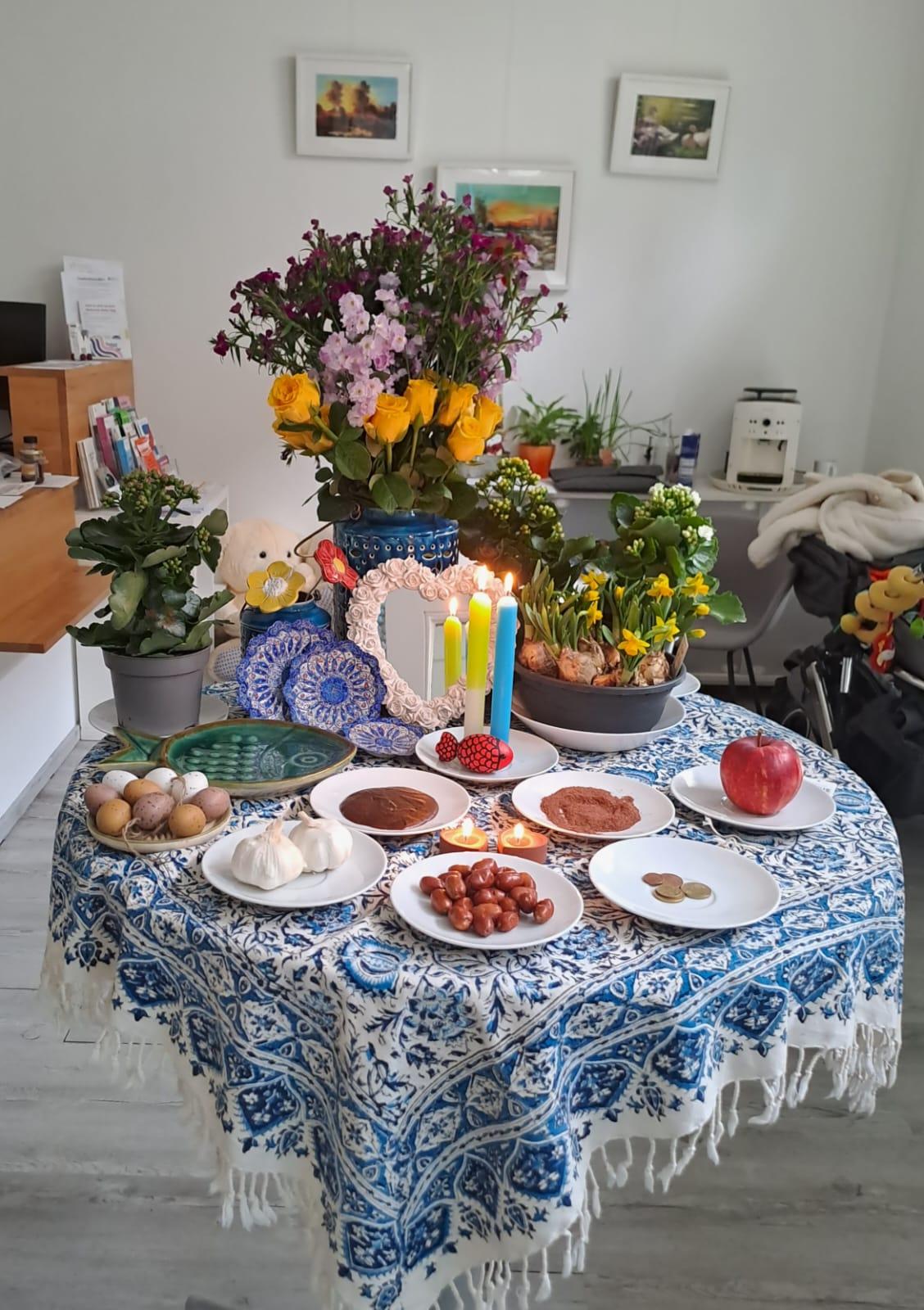 Der Nachmittag stand ganz im Zeichen des Frühlings und des Miteinanders. Mitgebrachte Blumen schmückten die Räume und sorgten für eine festliche, lebendige Atmosphäre. Ein besonderer Höhepunkt war der liebevoll vorbereitete Haft Sin, ein traditionell gedeckter Tisch, auf dem sieben symbolische Dinge mit dem Anfangsbuchstaben „S“ arrangiert werden, darunter zum Beispiel Äpfel (Sib) und Knoblauch (Sir). Die Gegenstände stehen sinnbildlich für Tugenden wie beispielsweise Gesundheit und Fröhlichkeit.