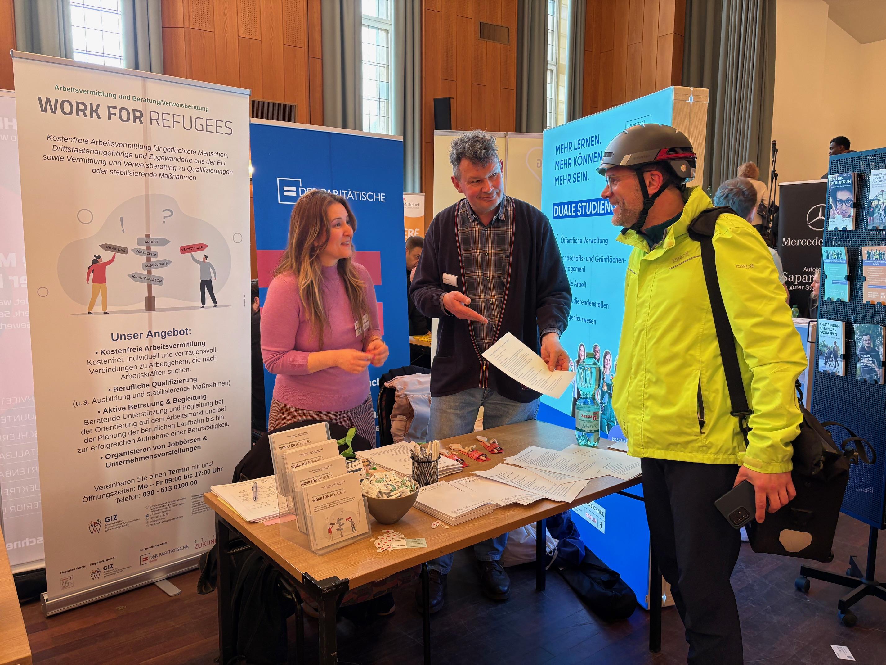 Die Jobmesse richtete sich gezielt an zugewanderte Menschen und bündelte Angebote rund um die Themen Beschäftigung, Ausbildung und Qualifizierung. Im Mittelpunkt der Gespräche am Beratungsstand von Work for Refugees standen die individuelle berufliche Orientierung, die Klärung von Fragen zum Arbeitsmarktzugang sowie die Vermittlung konkreter Perspektiven für den Berliner Arbeitsmarkt.