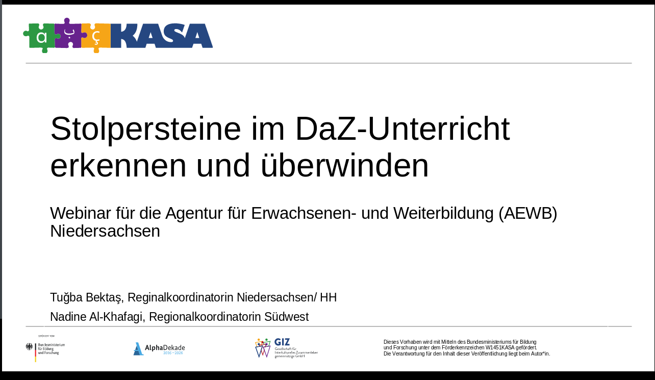„Stolpersteine“, unsere beliebte Sensibilisierungsschulung zum kontrastiven Ansatz, wurde am 26.August für die Agentur für Erwachsenen- und Weiterbildung (AEWB) online auf BigBlueButton durchgeführt. Die KASA-Regionalkoordinatorinnen Nadine Al-Khafagi und Tuğba Bektaş gaben den interessierten Teilnehmenden, darunter pädagogische Fachkräfte und Dozentinnen aus den unterschiedlichsten Einrichtungen in Niedersachsen, spannende Einblicke in die Sprachen Türkisch und Arabisch. So wurden häufige und immer wiederkehrende Fehler beim Schreiben aufgegriffen und thematisiert, sodass die Workshop-Teilnehmer*innen diese besser einschätzen und einordnen konnten. Mithilfe kurzer Schreibbtexte, die analysiert in Gruppenarbeit wurden, entwickelten die Teilnehmer*innen des Workshops ein besseres Verständnis für typische Fehlerquellen ihrer Lernenden.
