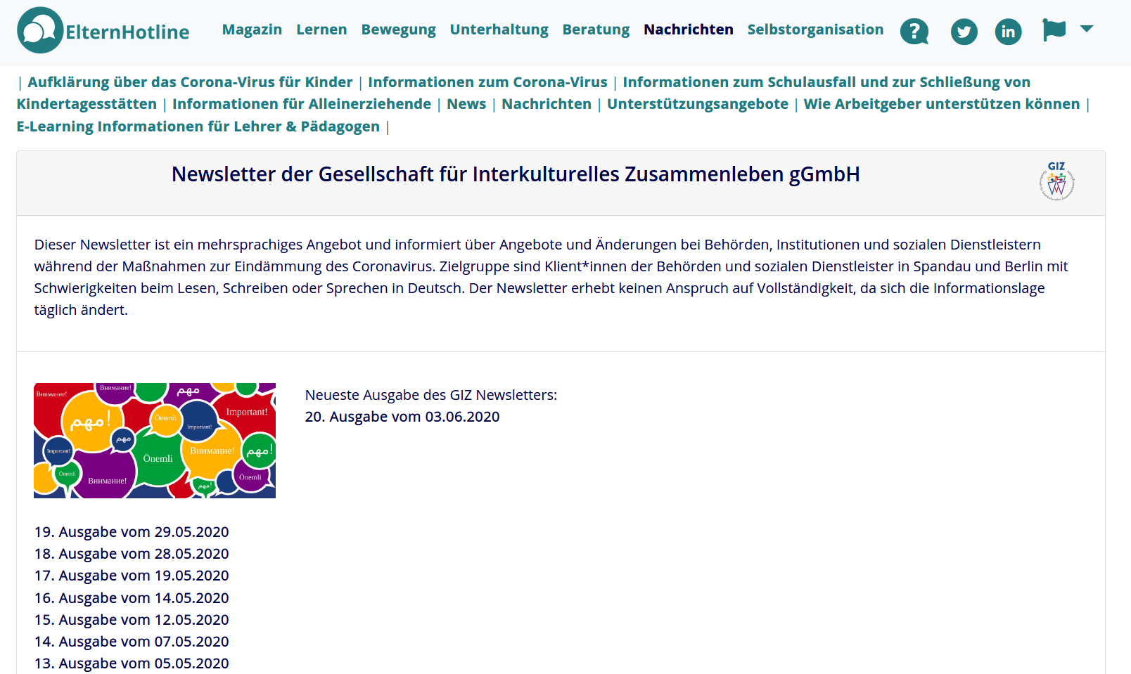 Die aktuelle Ausgabe des mehrsprachigen Newsletters der GIZ gGmbH ist direkt auf der Webseite der Elternhotline abrufbar. Auch ältere Versionen des Newsletters können von der Webseite der Elternhotline heruntergeladen werden: