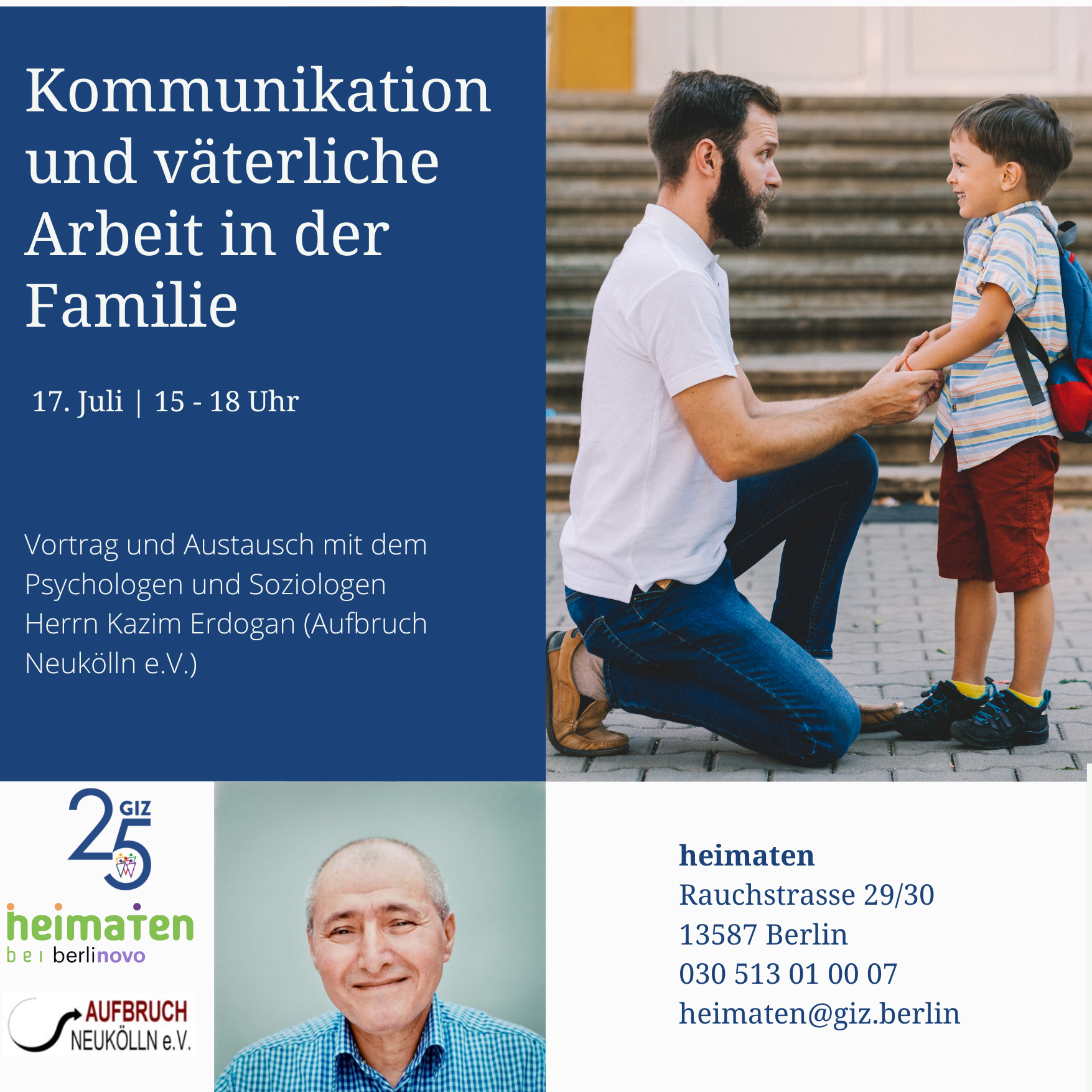 Am 17. Juli laden wir herzlich ein zu einem besonderen Vortrag und Austausch mit Kazim Erdogan – Psychologe, Soziologe (Aufbruch Neukölln e.V.). Thema: Kommunikation und väterliche Arbeit in der Familie.