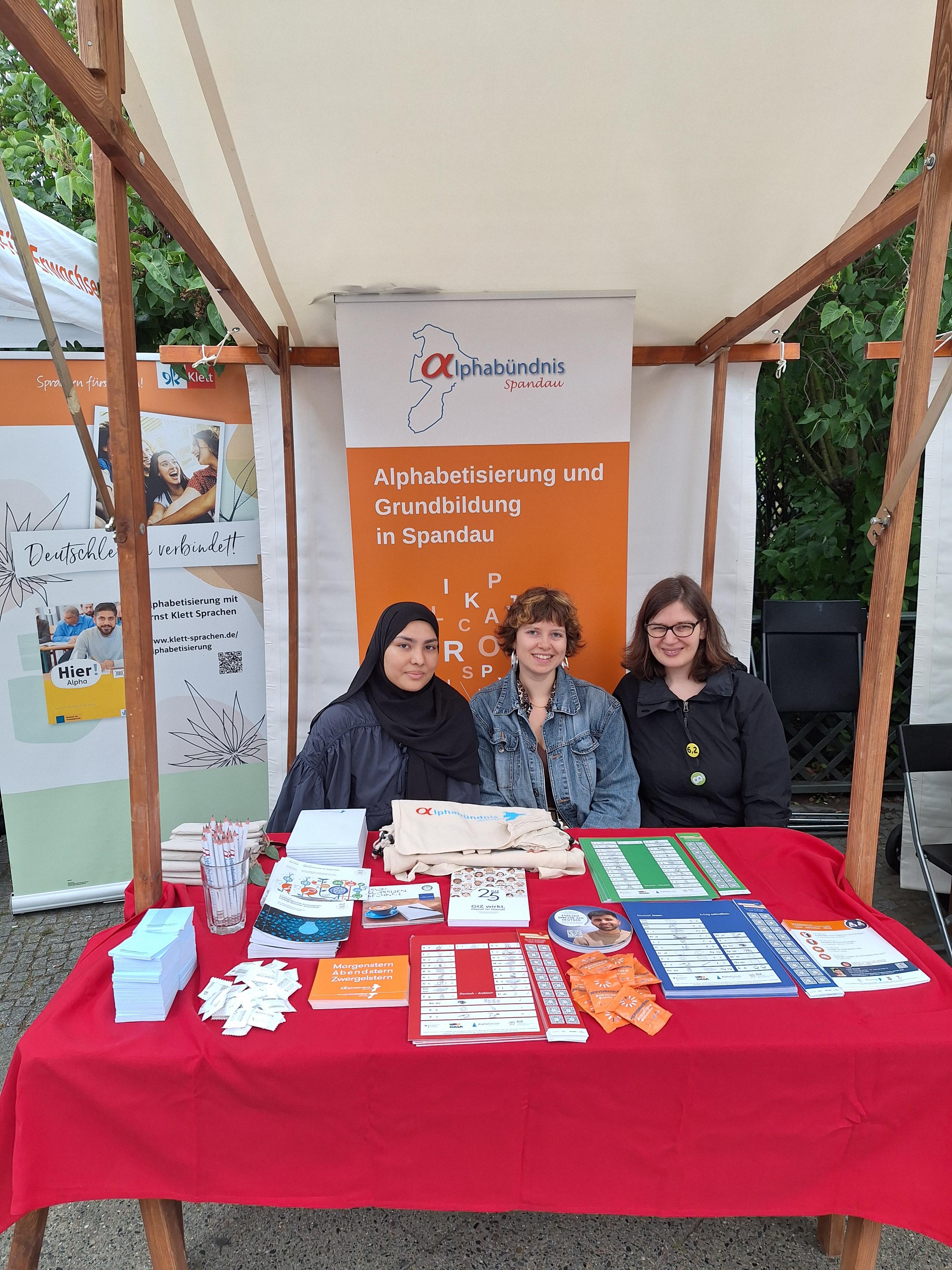 Am 9. Juli 2025 traf sich unser Alphabündnis Spandau mit dem Alphabündnis Charlottenburg-Wilmersdorf und dem ALFA-Mobil auf dem Mierendorffplatz, um gemeinsam, quasi zwischen den Bezirken, über funktionalen Analphabetismus, über den Alltag von Menschen mit Lese- und Schreibproblemen und über die vielen Lern- und Unterstützungsangebote aufzuklären, die es in Spandau und Charlottenburg gibt. Dabei waren die VHS, ein Mehrgenerationenhaus, die Mobile Bildungsberatung Spandau, die Beratung für Bildung und Beruf, Agens Spandau, natürlich die GIZ und viele andere Akteure. Ein starkes Team für Grundbildung!