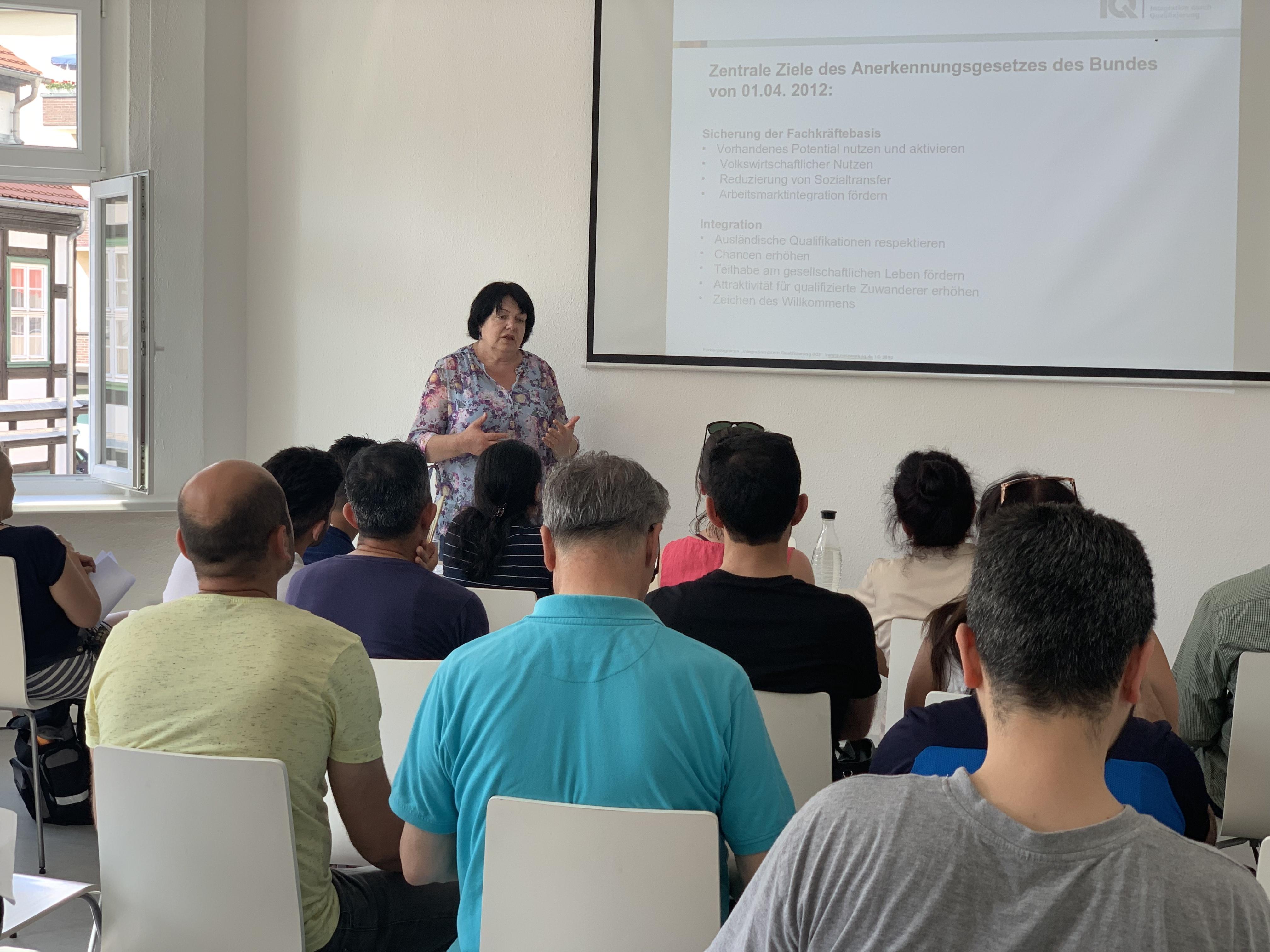 Am 19.06.2019 lud das WiA-Büro Vertreter*innen des IQ-Netzwerks zu einem Vortrag in den Veranstaltungsraum in der Jüdenstraße 30 ein. Frau Julia Merian, Leiterin der Anerkennungsberatung, gab dem Publikum einen Überblick über die Rahmenbedingungen für die Anerkennung ausländischer Berufsqualifikationen von Geflüchteten in Deutschland.