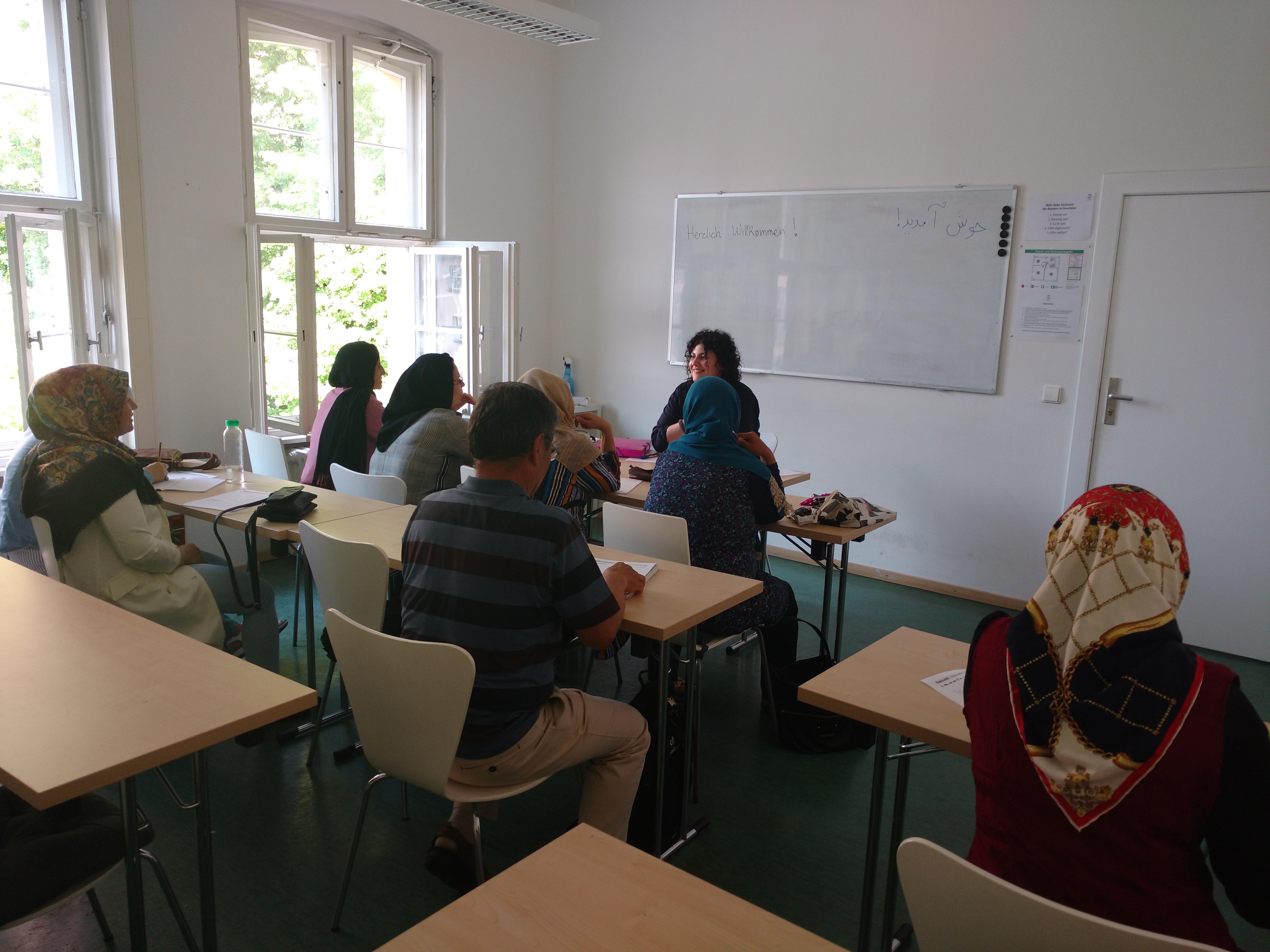 In den Räumlichkeiten der GIZ GmbH kamen am 6. Juni zwölf Lernende zum ersten Kurstag zusammen. Die Gruppe, bestehend aus zehn Frauen und zwei Männern, ist mit Persisch und/oder Dari als Muttersprache sprachhomogen zusammengestellt. Die bilinguale Lehrkraft unterstützt und begleitet die Lernenden auf ihrem Weg Deutsch lesen und schreiben zu lernen.