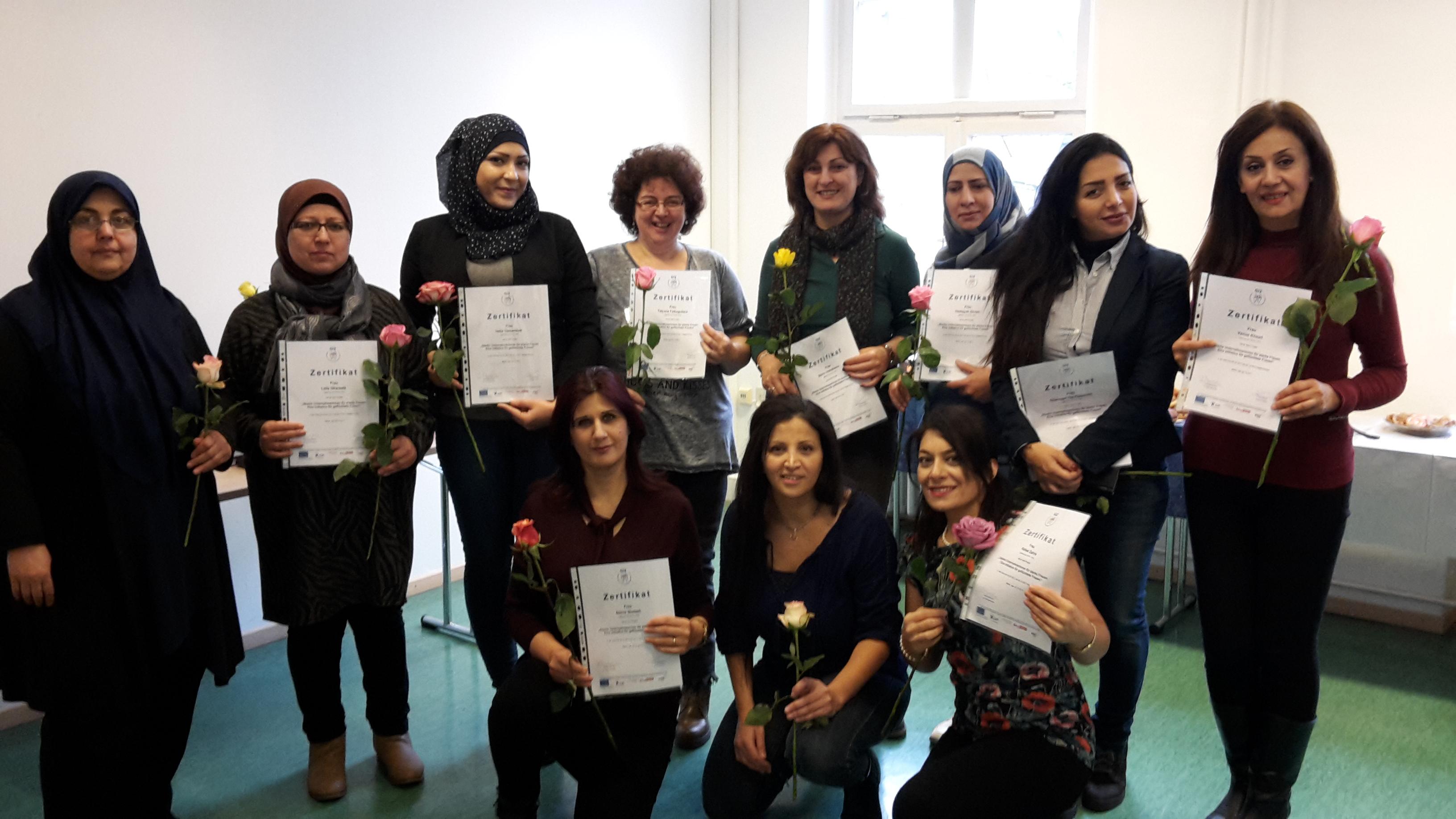 Nachdem die B2 Prüfung am 15.12.2017 erfolgreich abgeschlossen wurde, feierten die Teilnehmerinnen des Kurses „Starke Unternehmerinnen für starke Frauen“ ihren Abschied vom 6-monatigen Sprach- und Berufscoaching. Die Feier gestaltete sich gemütlich im kleinen Kreis, sodass jede Teilnehmerin ihr Zertifikat und ein kleines Geschenk mit motivierenden und persönlichen Worten für ihren weiteren Weg mitbekam. Sowohl der tägliche Unterricht, als auch das 14-wöchiges Praktikum bewies, dass die Teilnehmerinnen an Selbstbewusstsein und Stärke gewonnen haben. Für einige Frauen geht es dank der Unterstützung ihrer Mentorinnen und auch des PEB-Teams in ein Arbeitsverhältnis. Andere wiederum werden einen C1 Kurs besuchen oder zukünftig eine Ausbildung beginnen. Wir wünschen allen Teilnehmerinnen einen guten Start in ihr neues Berufsleben!