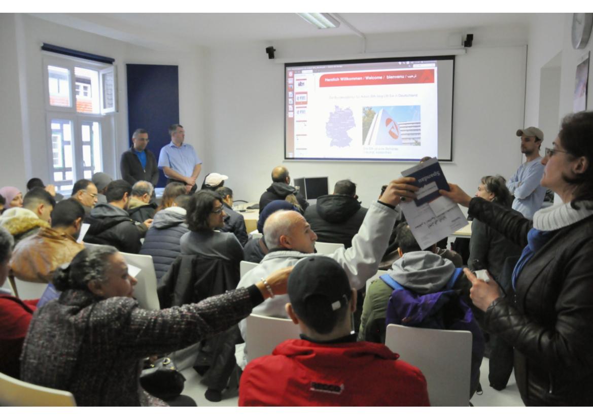 Im Anschluss nutzten die zahlreich erschienenen Teilnehmer*innen die Möglichkeit, dem Team der Arbeitsagentur Fragen zu stellen, und eine Erstberatung im WiA-Büro in Anspruch zu nehmen.