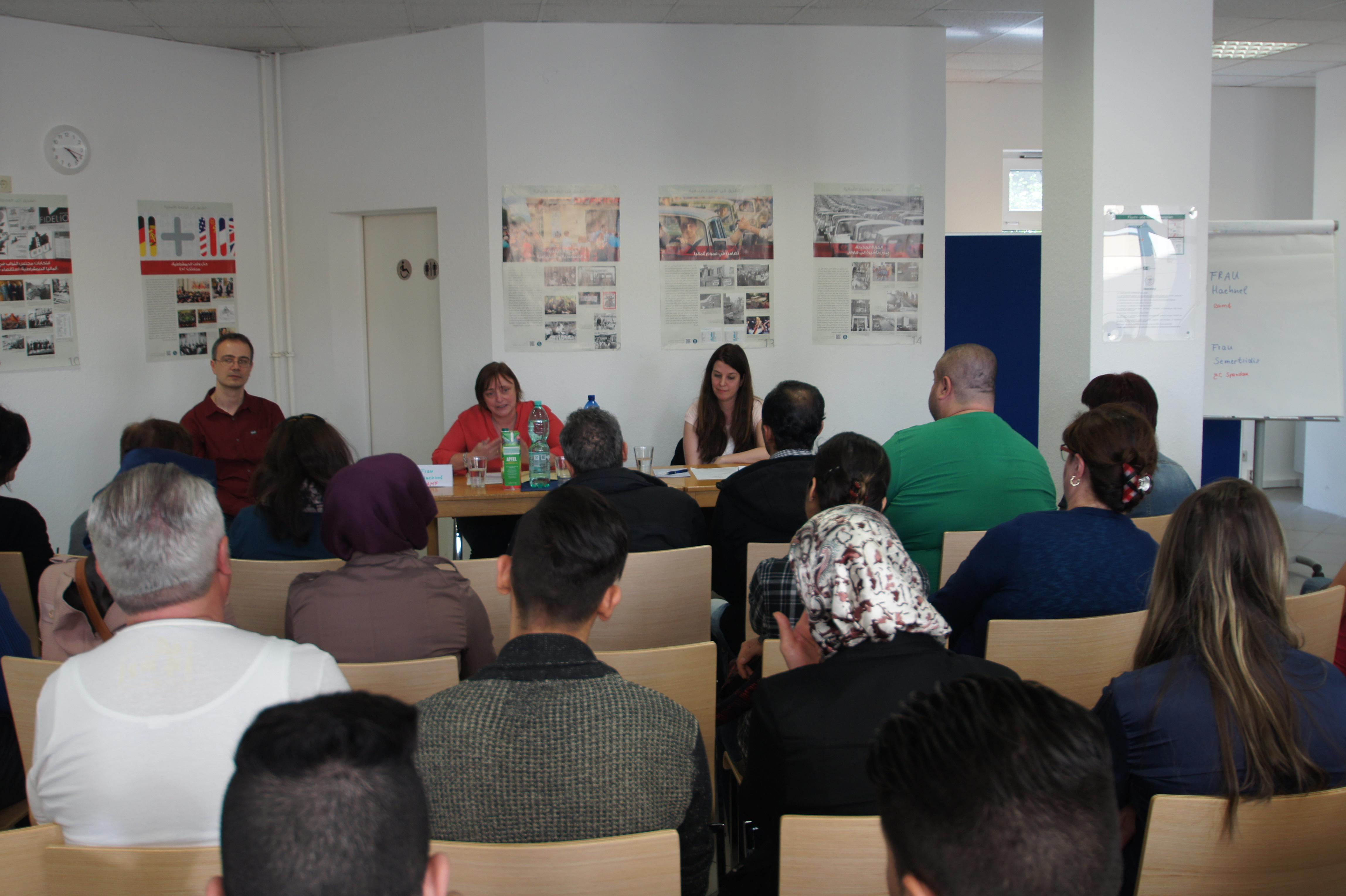 Am 09.05.2016 konnten wir Frau Hähnel, Regionalkoordinatorin beim Bundesamt für Migration und Flüchtlinge und Frau Semertsidis, Migrationsbeauftragte beim Jobcenter Berlin-Spandau in unseren Räumlichkeiten in der Mönchstraße anlässlich einer Informationsveranstaltung für unsere Integrationskursteilnehmenden begrüßen. Bei der Veranstaltung informierten unsere Gäste unsere Integrationskursteilnehmdnen über ihre Rechte und Pflichten. Im Anschluss hatten unsere Teilnehmenden die Möglichkeit Fragen an unsere Gäste zu stellen. Es war eine rundum gelungene Veranstaltung, die auf ein positives Echo stieß.