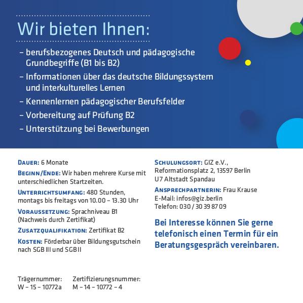Der Kurs richtet sich an Interessenten, die das Sprachlevel B1 erreicht haben, und sich beruflich im pädagogischen Bereich weiter Fortbilden möchten.