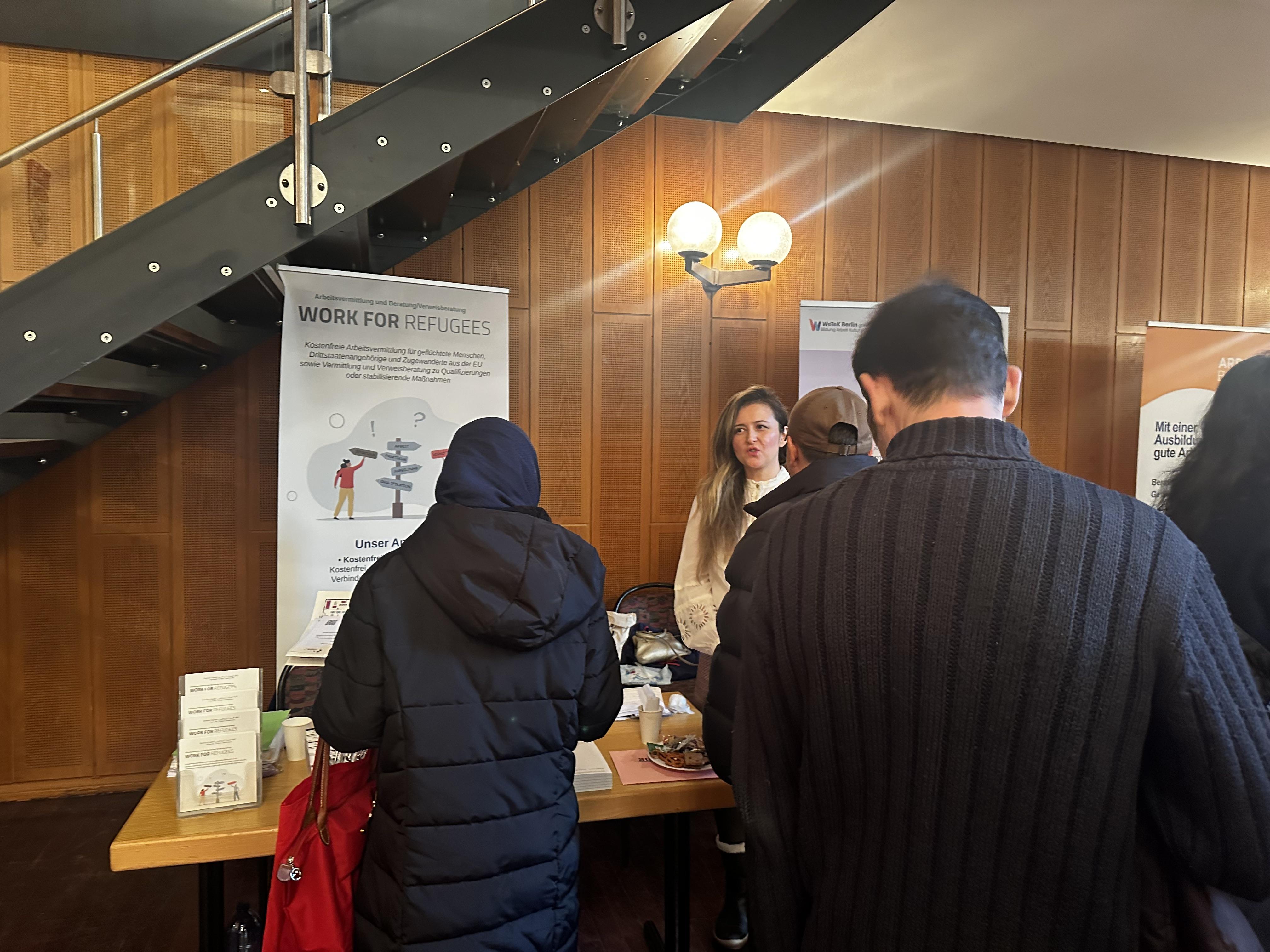 Am Stand von Work for Refugees führten wir eine Vielzahl intensiver Beratungsgespräche mit interessiertem Besucher*innen. Im Fokus standen dabei Fragen der beruflichen Orientierung, Strategien für eine erfolgreiche Bewerbung, Möglichkeiten der Qualifizierung sowie die ersten Schritte in den Berliner Arbeitsmarkt.