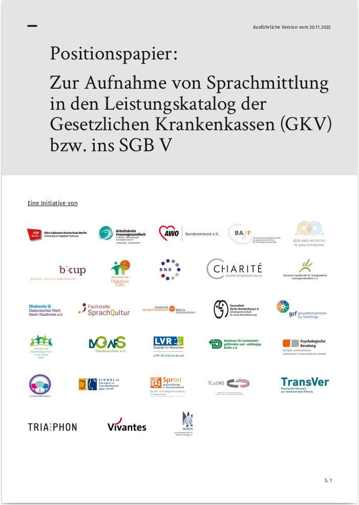 1) Aufnahme von Sprachmittlungsleistungen in den Katalog der GKV bzw. ins SGB V und in weiteren Gesetzen, z.B. AsylbLG;