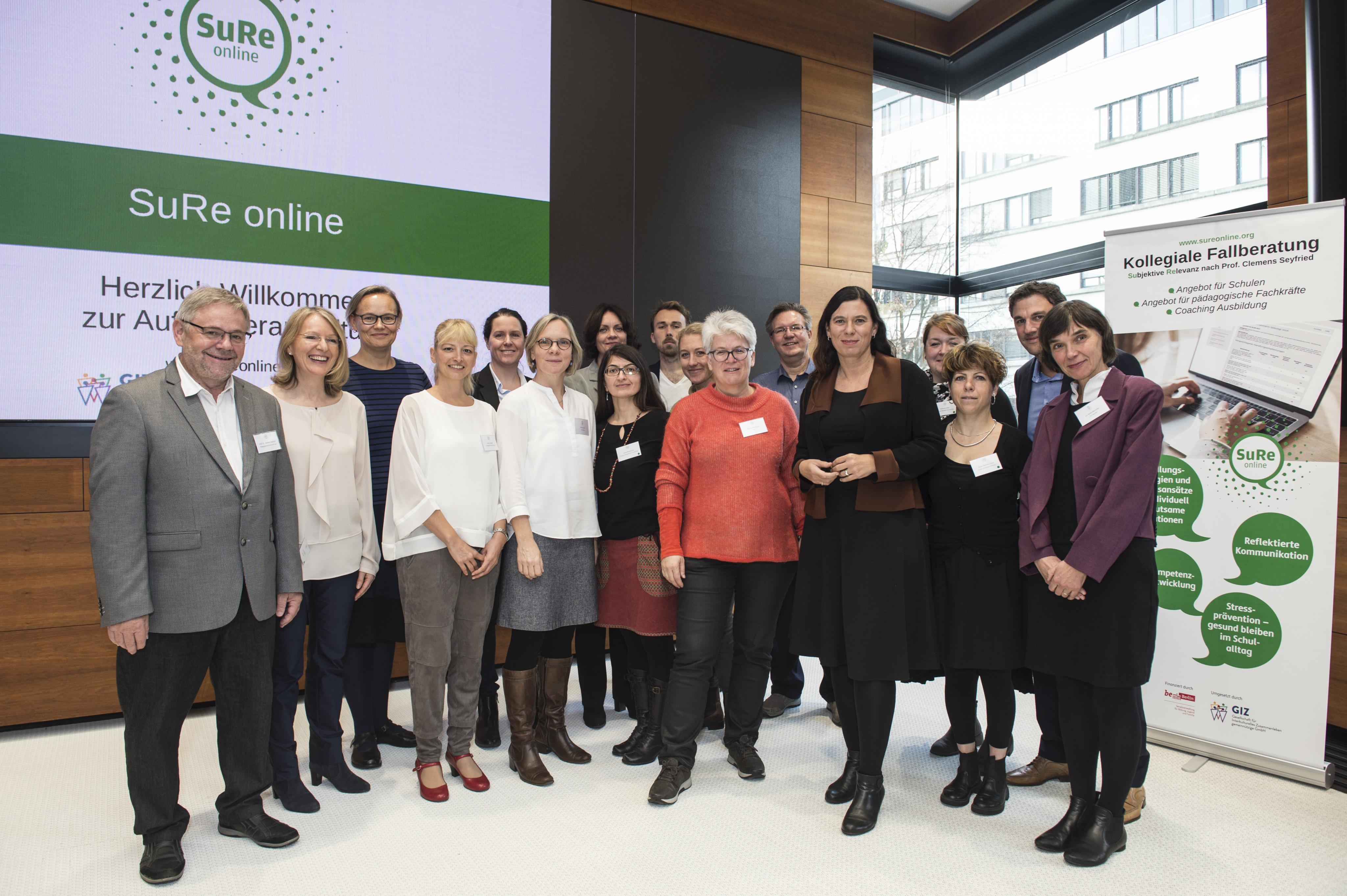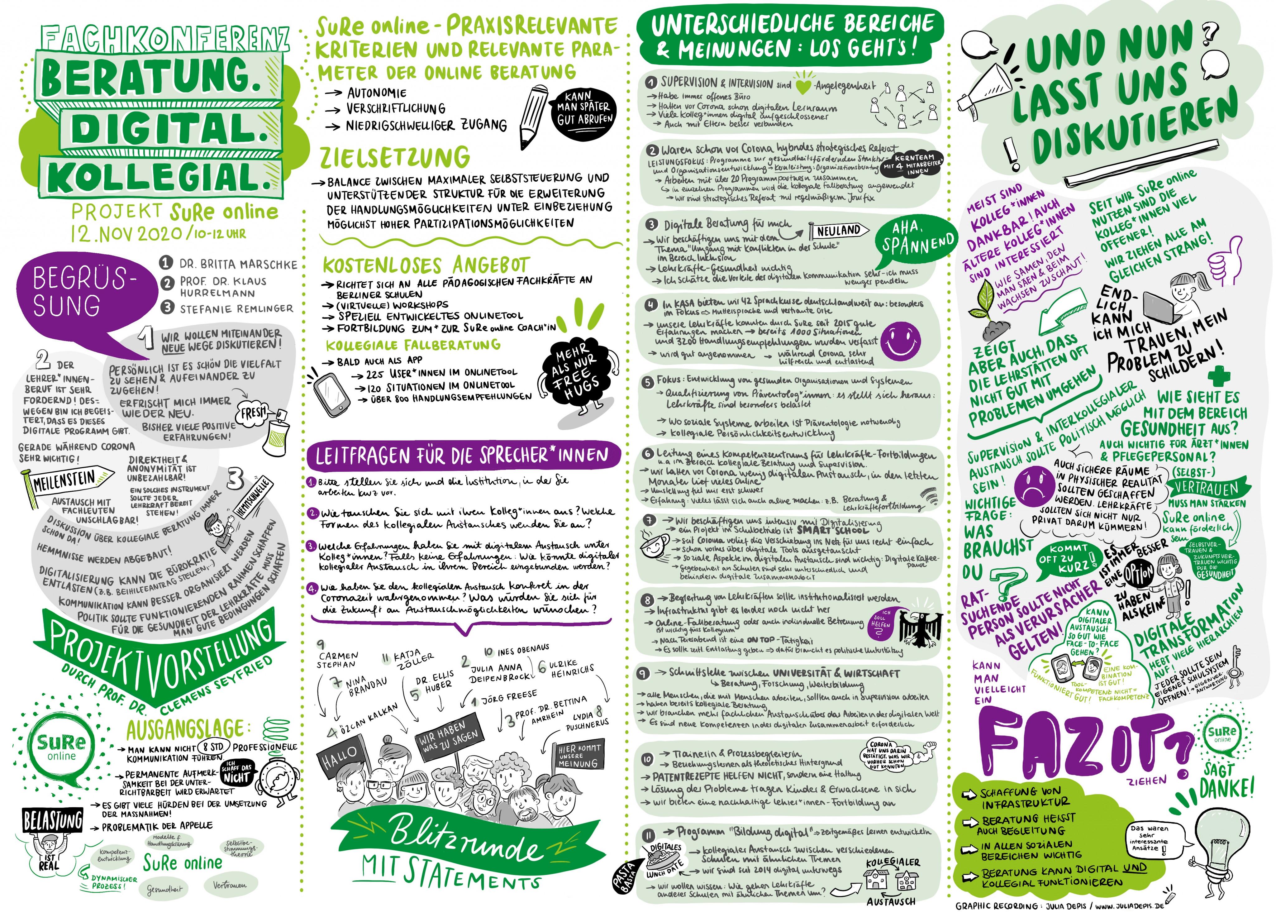 Seit August 2019 wird SuRe online auch für pädagogische Fachkräfte in Berlin angeboten. Das Projekt wird von der Senatsverwaltung für Bildung, Jugend und Familie (SenBJF) gefördert und durch die GIZ umgesetzt. Das Angebot ist für alle Teilnehmenden kostenlos und unterstützt die Reflexions- und Kompetenzentwicklung in der professionellen pädagogischen Arbeit. Das Online-Angebot wird durch Face-To-Face-Workshops sowie der Möglichkeit einer Fortbildung zum*r SuRe online Coach*in ergänzt. Bisher nehmen 20 Berliner Schulen am Projekt teil. Seit Juni 2020 gibt es zusätzlich einen Podcast zu verschiedenen Themen, z.B. Psychohygiene und Salutogenese im Schulalltag. Im November 2020 fand die erste digitale Fachkonferenz des Projektes mit dem Titel BERATUNG. KOLLEGIAL. DIGITAL. (Graphic Recording © Julia Depis) statt.