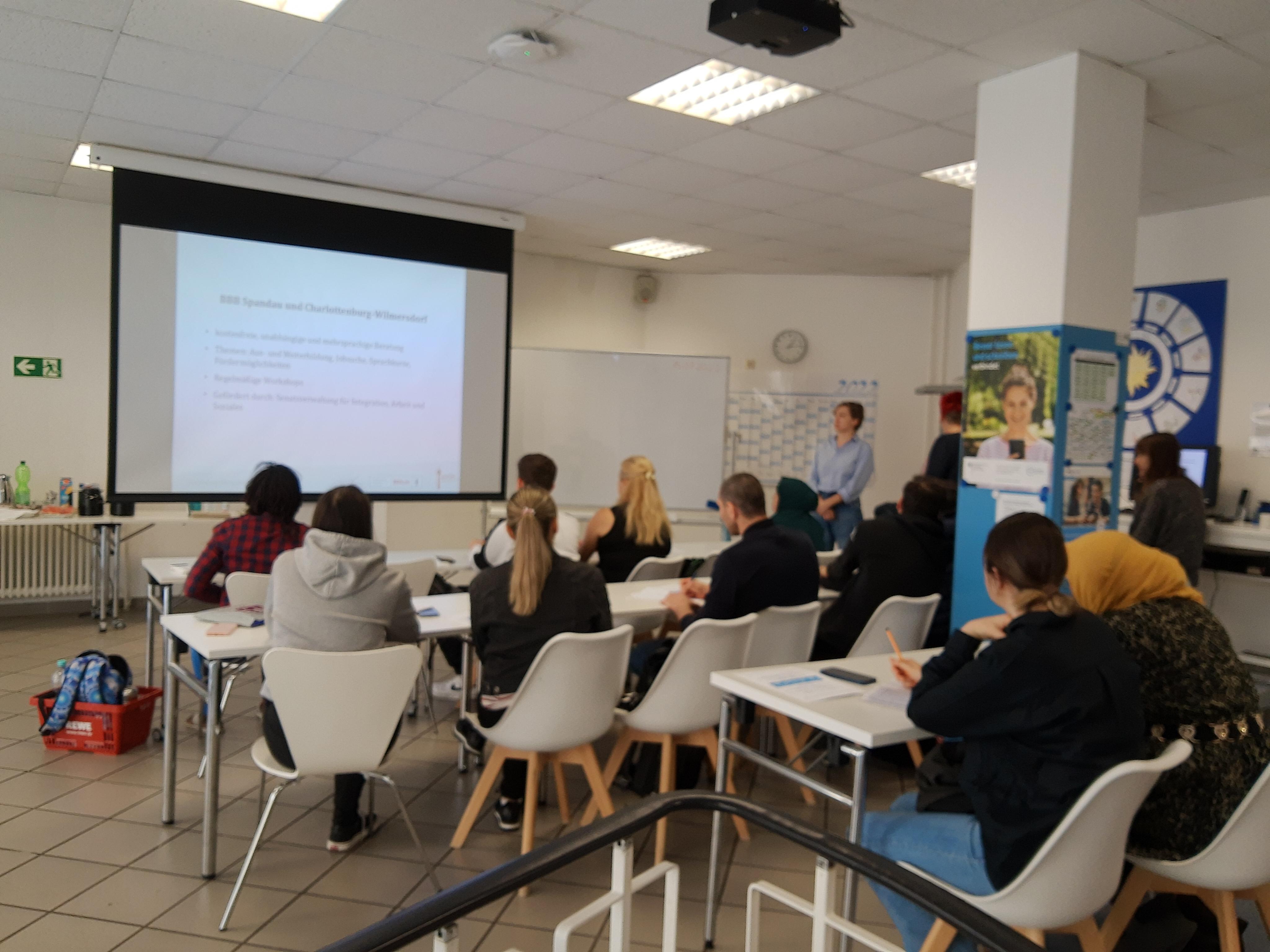 Die Veranstaltung wurde in Kooperation mit der Beratung zu Bildung und Beruf Spandau/Charlottenburg-Wilmersdorf (GesBiT) organisiert und fand am 15.07.2022 im Lerncafe Spandau (Mönchstraße 7, 13597 Berlin) statt. Die Teilnehmer*innen - zum Großteil aus der Ukraine geflüchtete Menschen – erhielten hierbei Informationen zum komplexen Berufsbildungssystem in Deutschland und konnten sich zu den verschiedenen Ausbildungsmöglichkeiten, Zugangsvoraussetzungen und Möglichkeiten der finanziellen und inhaltlichen Unterstützung während der Ausbildung informieren. Ebenso sollte vermittelt werden, welche Bedeutung der Berufsabschluss in Deutschland hat und welche Vorteile das Arbeiten als Fachkraft mit sich bringt. Zum Abschluss konnten die Teilnehmer*innen Fragen stellen sowie individuelle Beratungstermine vereinbaren, um persönliche Anliegen klären zu können.