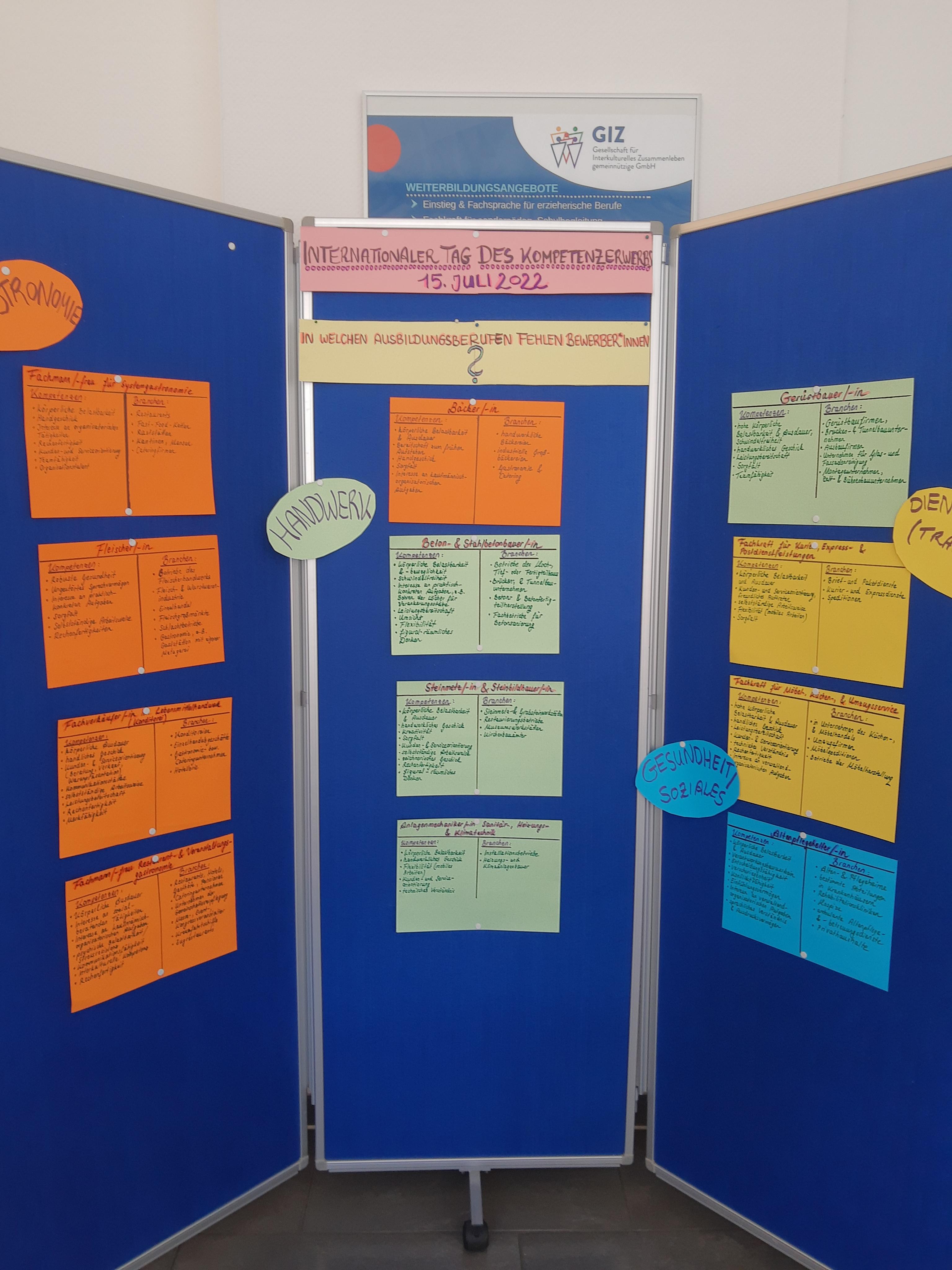 Ebenso bereitete das Team des WiA-Büro Spandau eine Pinnwand mit farbigen Kartons vor, auf denen diverse Ausbildungsberufe aus den Branchen Gastronomie, Handwerk, Dienstleistungen im Bereich Transport sowie Gesundheit/Soziales vorgestellt wurden. Hierbei wurden Ausbildungsberufe mit Besetzungsproblemen gewählt, d.h. bei denen das Angebot ans freien Ausbildungsplätzen in der Regel höher ist als die Nachfrage. Der Fokus lag hierbei auf den Kompetenzen, die für die jeweiligen Berufe vorausgesetzt werden sowie auf der Vorstellung der typischen Brachen, in denen die jeweiligen Fachkräfte üblicherweise eine Beschäftigung finden können.