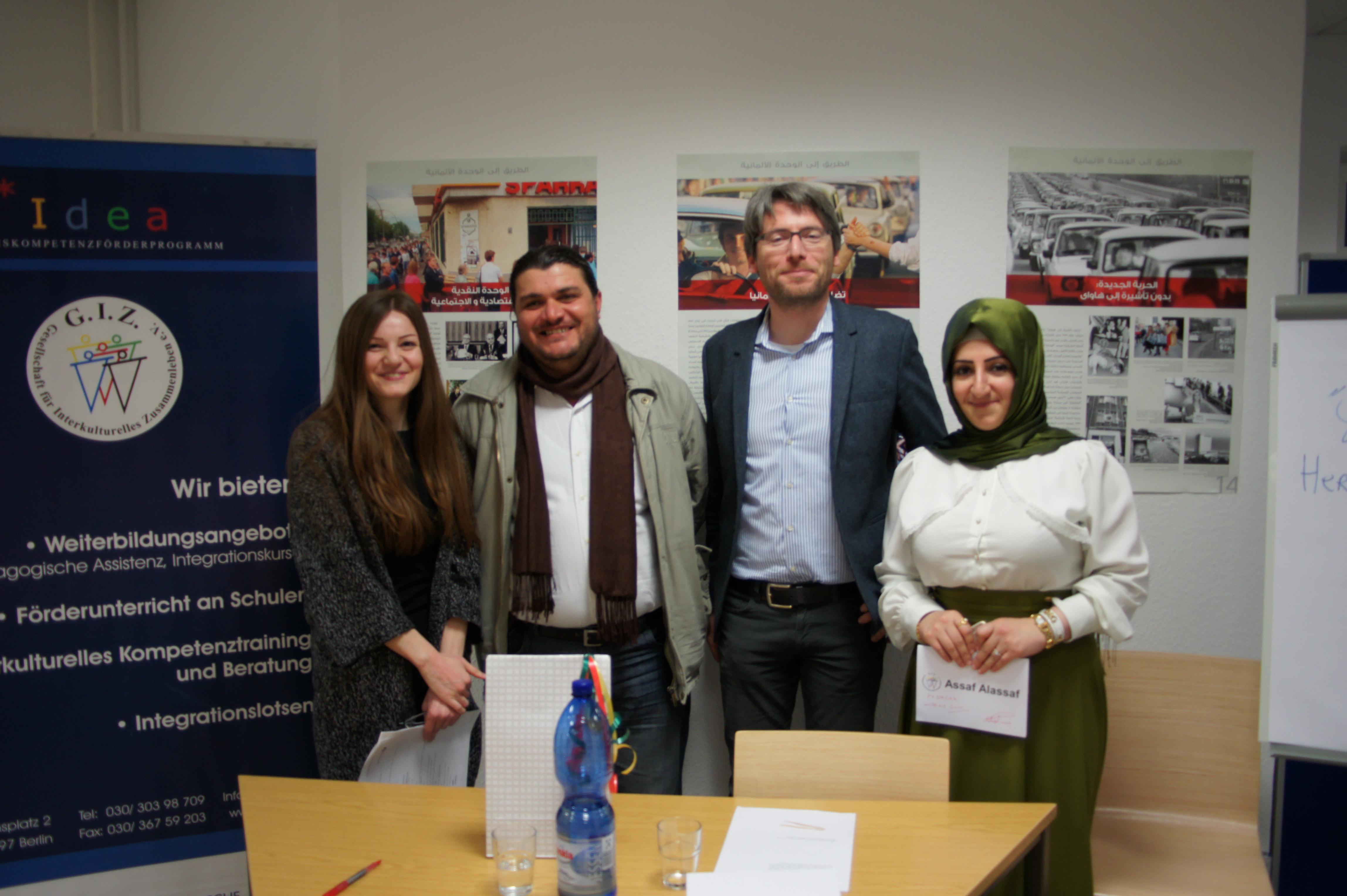 Am 26.02.2016 fand die von Swen Schulz initiierte Ausstellung zur “Deutschen Einheit“ in den Räumlichkeiten der GIZ in der Mönchstraße ihren feierlichen Abschluss. Als Zeichen des Willkommens war es seit dem 18.12.2015 für die geflüchteten Neuspandauerinnen und Neuspandauern möglich, den Weg der deutschen Geschichte, mit Beginn der friedlichen Revolution 1989 bis heute, auf 20 Plakaten in arabischer Sprache nachzulesen. Eingeladen war an diesem Abend der Stipendiat des Literarischen Colloquiums Berlin, der Syrer Assaf Alassaf. Die Lesung zu seinen literarischen Texten über die Revolution und den Krieg in seiner Heimat, zog zahlreiche Besucher*innen an. Im Anschluss erhielten die Gäste die Möglichkeit Fragen zu stellen.