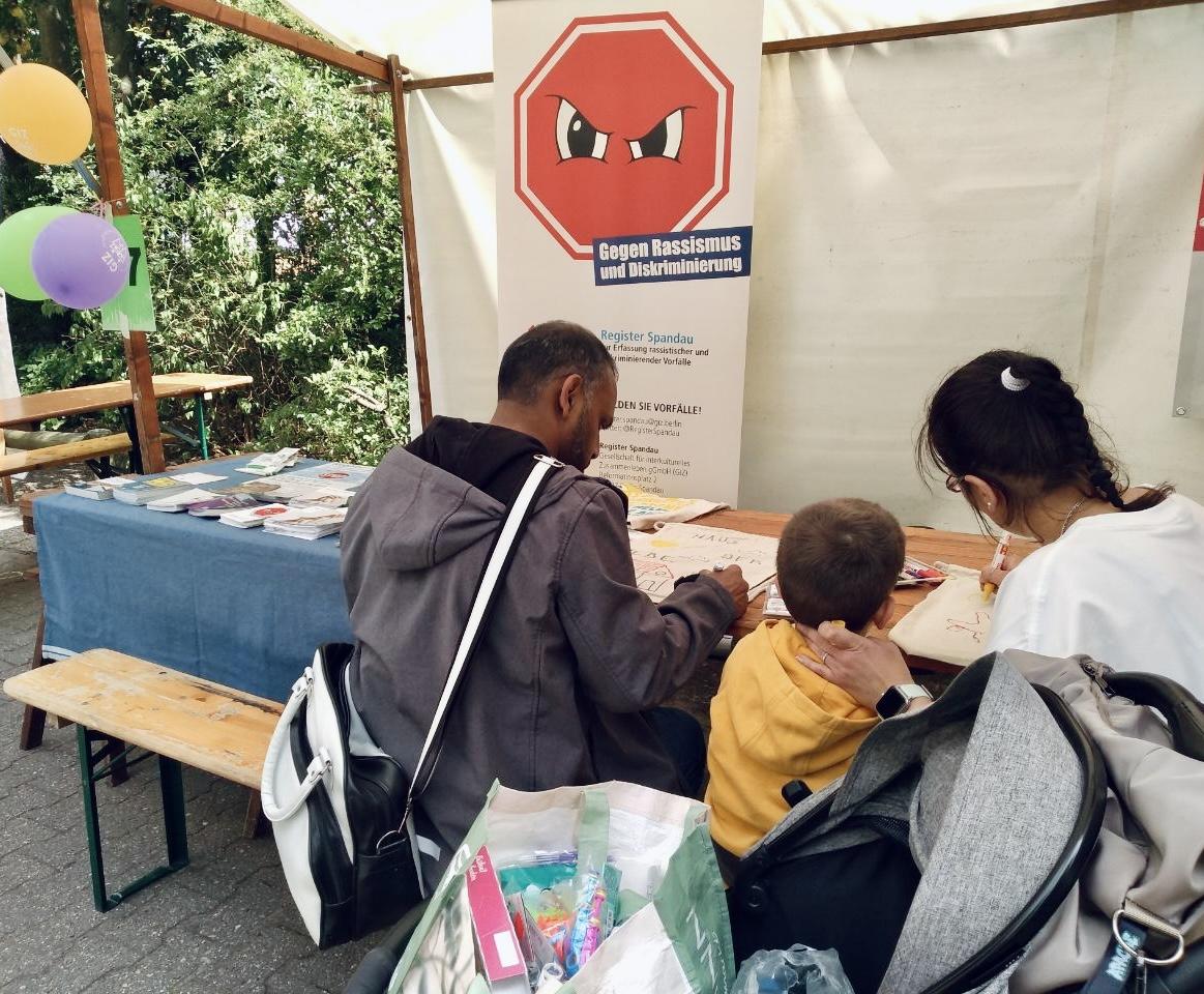 Die Integrationslots*innen unterhielten die Kinder mit Bewegungsbingo und Glücksrad, während die Eltern sich über den Träger informierten und Flyer mitnahmen. Auch die Registerstelle Spandau war mit Flyern und einer Aktion für Kinder vor Ort: Turnbeutel mit Register-Logo konnten mit Stoffmalfarben bemalt werden.