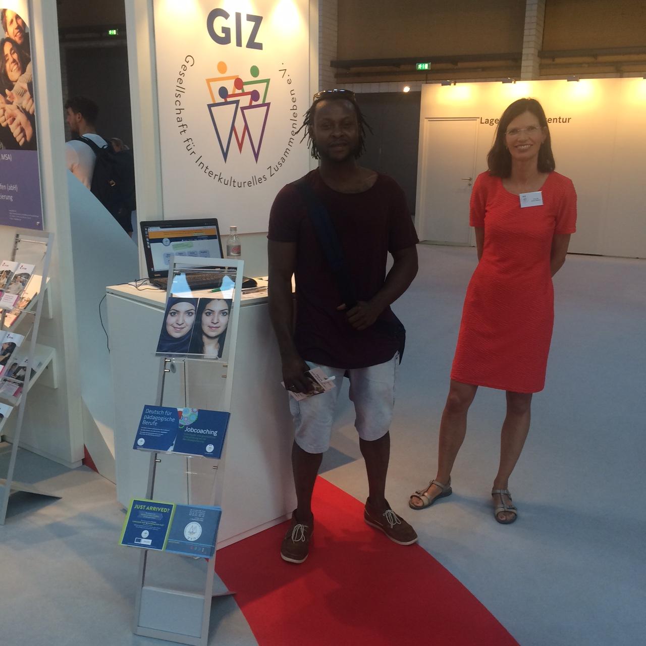 Wie letztes Jahr hatte GIZ e. V. auch 2016 einen Stand auf der Jobaktiv-Messe in der Berliner Arena in Kreuzberg. Zahlreichen Interessierten haben wir das vielfältige Bildungs- und Beratungsangebot von GIZ näher gebracht, Flyer ausgeteilt und vor allem Kontakte geknüpft. Dies nicht nur zu potentiellen Teilnehmer*innen, sondern auch möglichen Bewerber*innen sowie anderen Bildungsträgern und Arbeitgebern auf der Messe. Wir rechnen mit wachsender interkultureller Zusammenarbeit und Vernetzung - so werden wir nächstes Jahr wieder auf der Jobaktiv-Messe vertreten sein.