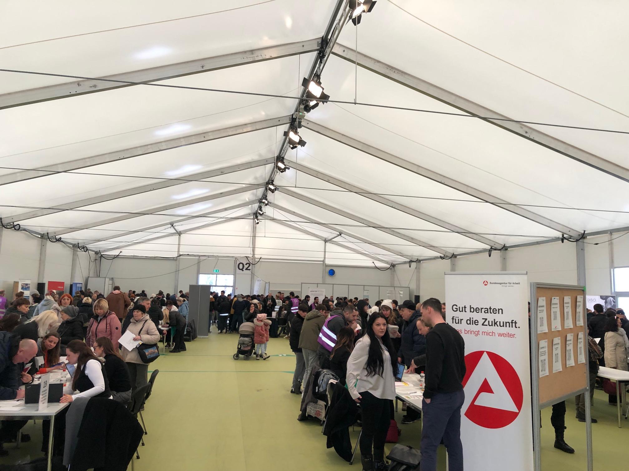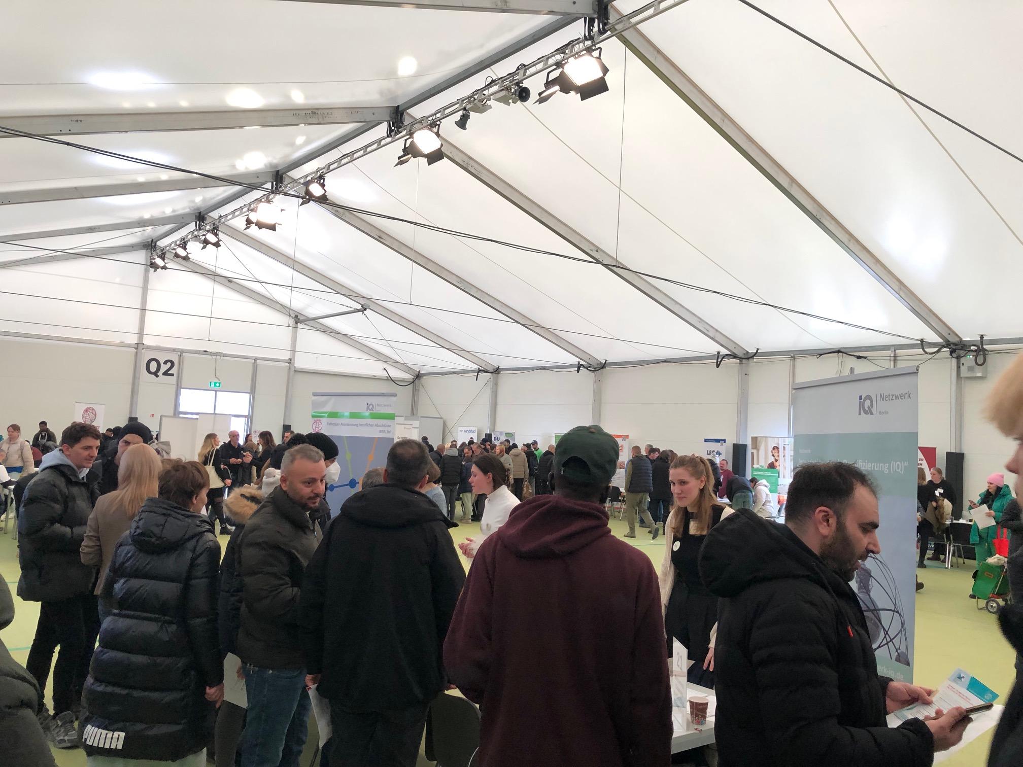 Großen Anklang fand die 2. Tegel-Jobbörse am 21.02.2025 in der Ankunfts- und Notunterbringungseinrichtung Tegel (ANo-TXL). Die Geflüchteten, ob aus der Ukraine oder anderen Herkunftsländern, zeigten Interesse an den vielfaltigen Jobangeboten, über die man sich hier informieren konnte. Die Jobmesse wurde vom Projekt „Work for Refugees" gemeinsam mit dem Berliner Roten Kreuz und dem Landesamt für Flüchtlingsangelegenheiten mit großem Engagement vorbereitet und durchgeführt. Das Projekt "Work for Refugees“ wird von der Senatsverwaltung für Arbeit, Soziales, Gleichstellung, Integration, Vielfalt und Antidiskriminierung gefördert und umgesetzt durch die Gesellschaft für interkulturelles Zusammenleben gGmbH und den Kooperationspartnern Paritätischer Wohlfahrtsverband LV Berlin e.V. sowie Stiftung Zukunft Berlin.