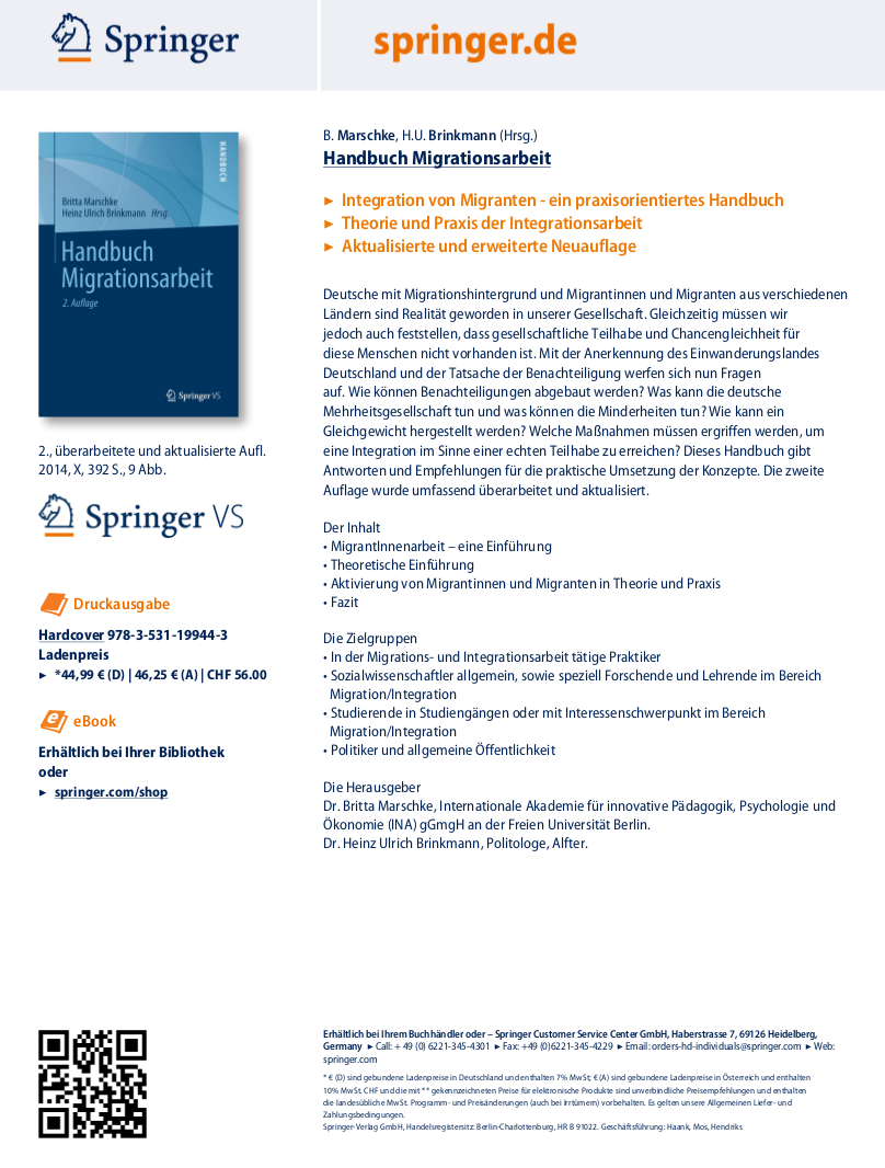 Erhältlich ist das Handbuch Migrationsarbeit (2. Auflage) bei Ihrem Buchhändler oder- – Springer Customer Service Center GmbH, Haberstrasse 7, 69126 Heidelberg.
