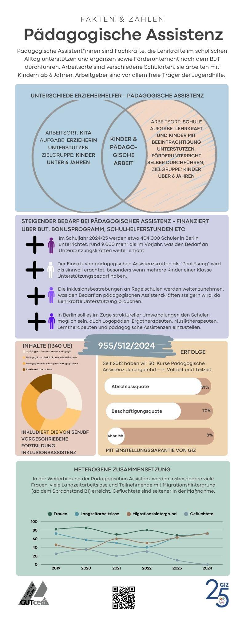 Mit dem erfolgreichen Abschluss der Weiterbildung ist der Aufgabenbereich der Pädagogischen Assistent*innen gegenüber dem der Erzieherhelfer*innen sehr vielfältig. Die Pädagogischen Assistent*innen unterstützen die Lehrkräfte nicht nur im schulischen Alltag mit Hilfe des Berliner Bonus-Programms, sondern arbeiten eigenständig nach dem Bildungs- & Teilhabepaket mit den Kindern im Rahmen der ergänzenden Lernförderung. In unserer Weiterbildung ist außerdem die Fortbildung zur Inklusionsassistenz inkludiert, wodurch unsere Pädagogischen Assistent*innen einen Beitrag zur Sicherung des erfolgreichen Schulbesuchs von Kindern mit Beeinträchtigung leisten.