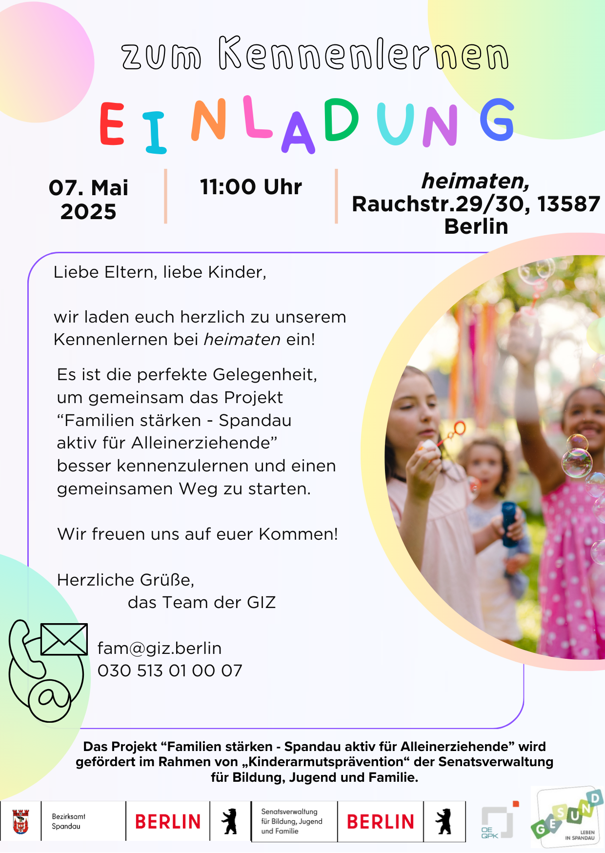 Am 1. Mai konnte das Projekt "Familien stärken - Spandau aktiv für Alleinerziehende" starten. Das Projekt wird gefördert im Rahmen von „Kinderarmutsprävention“ der Senatsverwaltung für Bildung, Jugend und Familie.