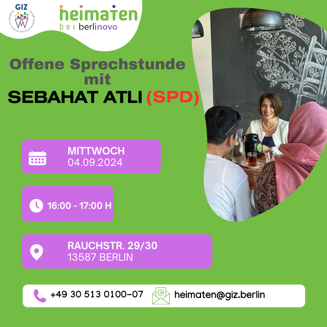 Am 04.09.2024 um 16:00 h freuen wir uns erneut auf Frau Sebahat Atli (SPD), MdA. Jede Bürgerin und jeder Bürger kann sich mit ihren bzw. seinen Anliegen an Frau Atli wenden, welche sich für die Interessen der Spandauerinnen uns Spandauer einsetzt und ihre Anliegen ernst nimmt.