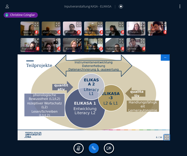 Am 6. Mai fand im Rahmen unserer turnusmäßig stattfindenden Inputveranstanstaltung ein erster wissenschaftlicher Austausch zwischen den Projekten KASA und ELIKASA statt. Die Veranstaltung wurde auf der Onlineplattform BigBluebutton durchgeführt. Die fachliche Moderation übernahm Prof. Karen Schramm von der Universität Wien. Im ersten Teil des sechsstündigen Inputs stellte das Team um Prof. Christine Czinglar (Universität Jena) die Erhebungsinstrumente für die Kategorien Phonologisches Bewusstsein, Lesekompetenz sowie der Schreibkompetenz vor. Im Anschluss wurde die organisatorische Planung der Datenerhebung im Plenum diskutiert und in Gruppenarbeit verfeinert.