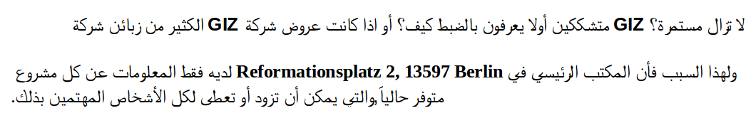 Rất nhiều khách của GIZ gGmbH hiện đang không ổn định và không biết liệu các dịch vụ của GIZ hiện đang được tiếp tục như thế nào. Vì lý do này, văn phòng chính của GIZ gGmbH tại Reformationsplatz 2, 13597 Berlin có thông tin về từng dự án với thông tin có sẵn hiện tại, có thể được ban giao cho những ai quan tâm.
