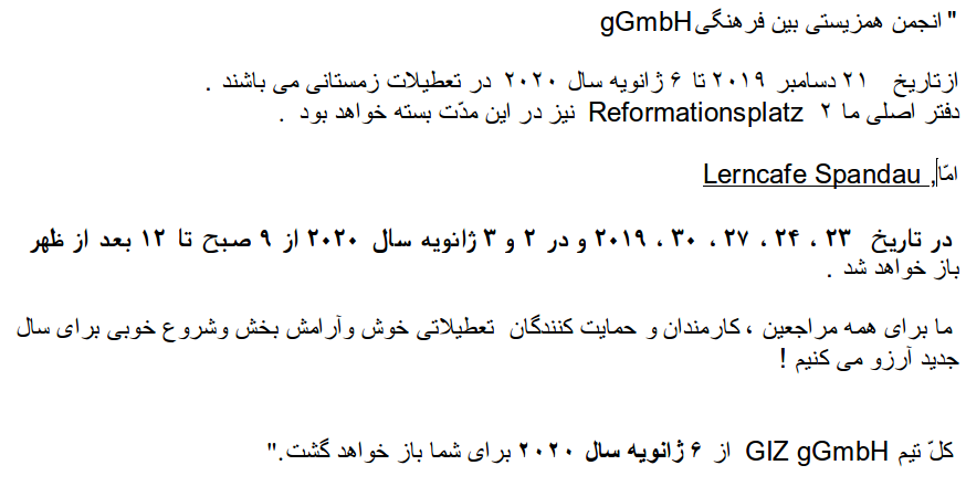 Die Mitarbeiterinnen und Mitarbeiter der GIZ gGmbH sind ab 6. Januar 2020 wieder für sie da.