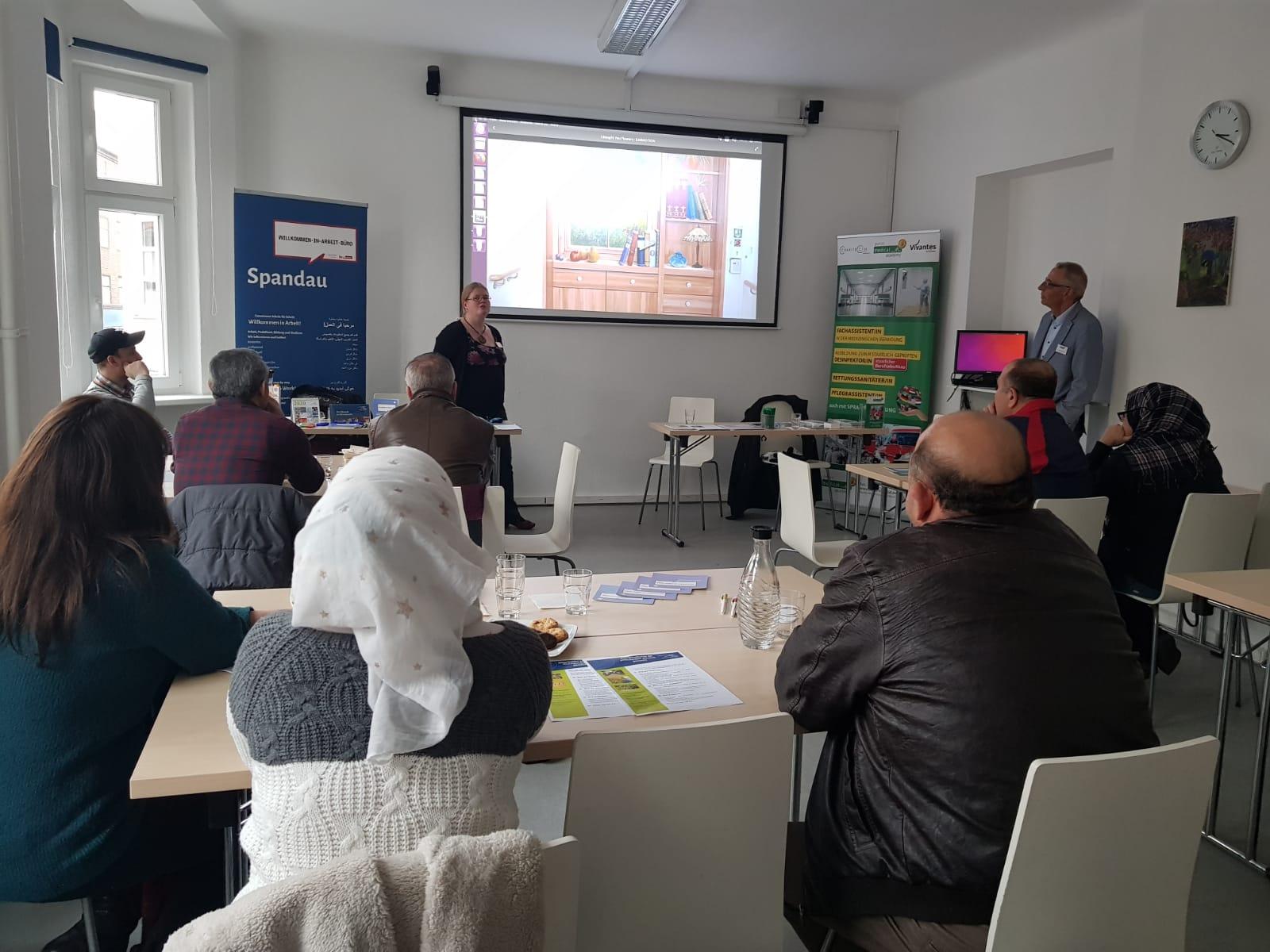 Am 13.11.2019 wurde die Informations-veranstaltungsreihe zu verschiedenen Berufsfeldern im WiA-Büro Spandau fortgesetzt. Dieses Mal wurde sich gezielt dem Thema Betreuung und Pflege gewidmet. Gemeinsam mit unserem Kooperationspartner Work for Refugees und Vertreter*innen der Purus Medical Academy und der Albert Schweitzer Stiftung wurden die wichtigsten Aspekte rund um die Themen Betreuung und Pflege beleuchtet und diskutiert. In den Vorträgen wurde zum einen auf Unterschiede in den theoretischen Grundlagen der schulischen Weiterbildungen im Bereich Betreuung und Pflege eingegangen. Zum anderen wurde durch die Albert Schweizer Stiftung über die verschiedenen und aktuell auf dem Arbeitsmarkt nachgefragten Stellenprofile Pfleger, Pflegehelfer und Pflege Servicekraft informiert. Die Veranstaltung stieß auf reges Interesse bei den Teilnehmer*innen, die die Gelegenheit nutzten, um den beiden Experten der Pursu Medical Academy und der Albert Schweitzer Stiftung zahlreiche Fragen zu stellen.