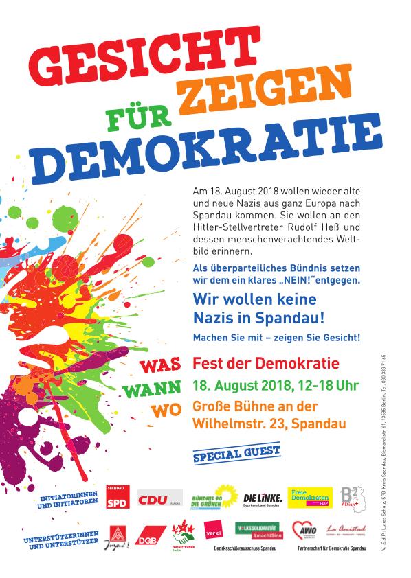 Anlass ist die Ankündigung von rechtsextremen Gruppen, an diesem Tag dem rechtskräftig verurteilten Kriegsverbrecher Rudolf Heß zu gedenken und ab 12 Uhr durch Berlin-Spandau zu marschieren. Wir wollen zeigen, dass wir zu einer ehrlichen Erinnerungskultur stehen und die Verantwortung übernehmen, dass sich die Gräuel der Diktatur des Nationalsozialismus nicht wiederholen. Für eine solche demokratische Gesellschaft stehen wir ein!