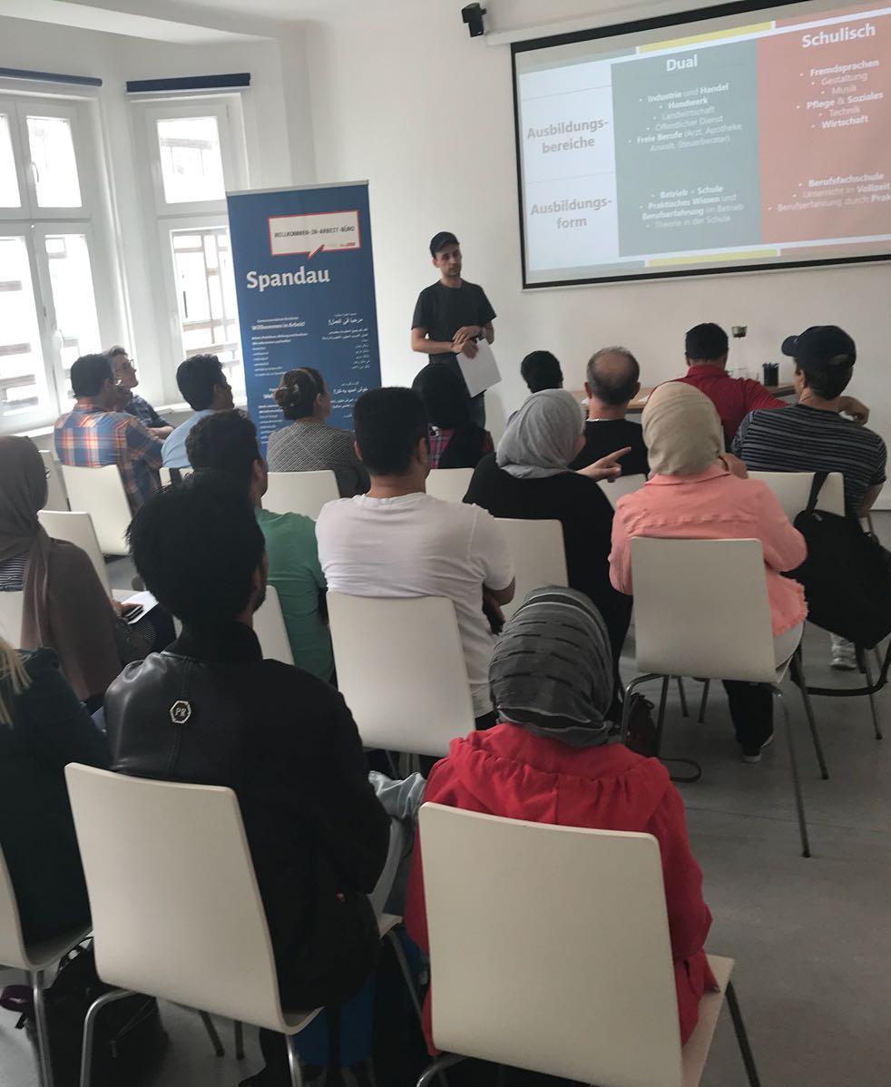 Die Vorstellung der Angebote sowie die Frage-und-Antwort-Runden wurden von beiden jeweils selbst ins Arabische und Farsi gedolmetscht, wodurch die mehrsprachige Kommunikation einwandfrei funktionierte. Die Teilnehmenden zeigten großes Interesse und konnten nützliche Erkenntnisse für ihren weiteren beruflichen Weg in Deutschland gewinnen.