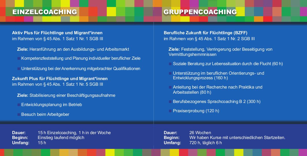 Es besteht die Möglichkeit an einem 15 Unterrichtseinheiten umfassenden Einzelcoaching (Aktiv Plus oder Zukunft Plus) oder einem sechsmonatigem Gruppencoaching mit telc-Deutschprüfung B 2 (Berufliche Zukunft für Flüchtlinge/Migranten) teilzunehmen.