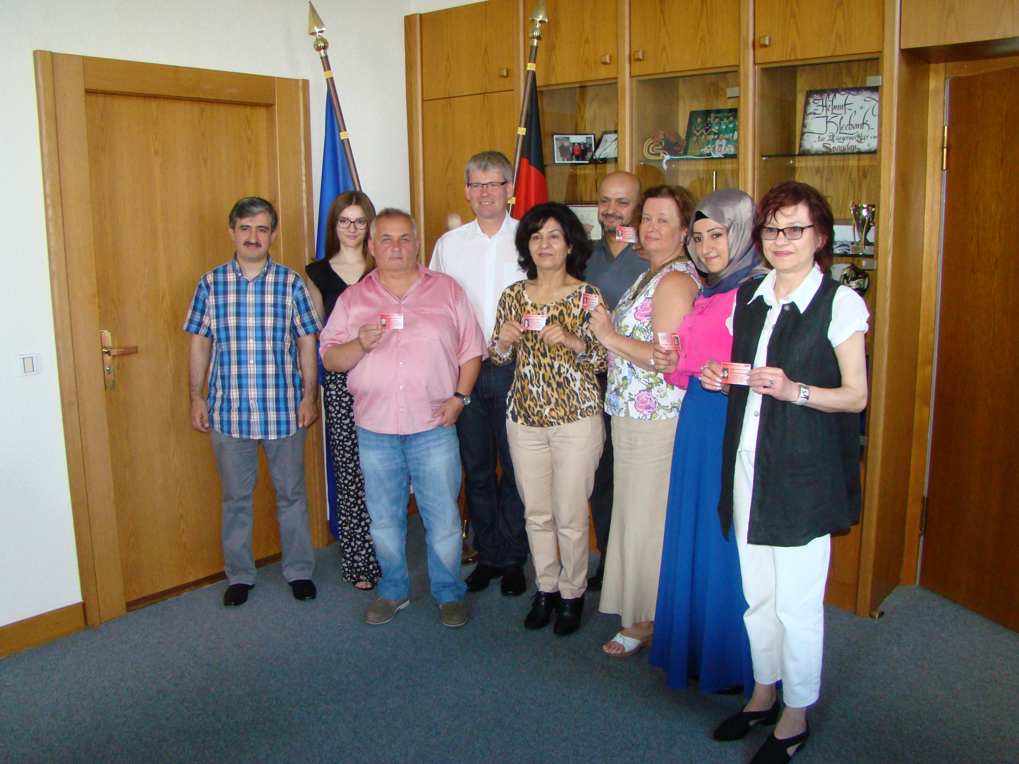 Bürgermeister Kleebank überreichte am 06.08.2015 den Integrationslots*innen im Rathaus den Spandauer Dienstausweis. Hiermit können sich die Integrationslots*innen legitimieren, wenn sie einen Termin bei einem Amt oder einer Behörde haben. Damit unterstützt der Bezirk die Arbeit der Lots*innen, Wartezeiten können minimiert werden. Spandau ist der einzige Bezirk, der die Lots*innen mit einem Dienstausweis ausgestattet hat.
